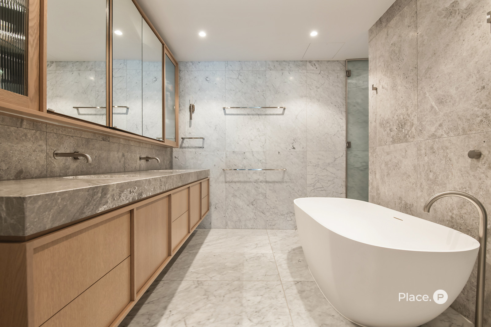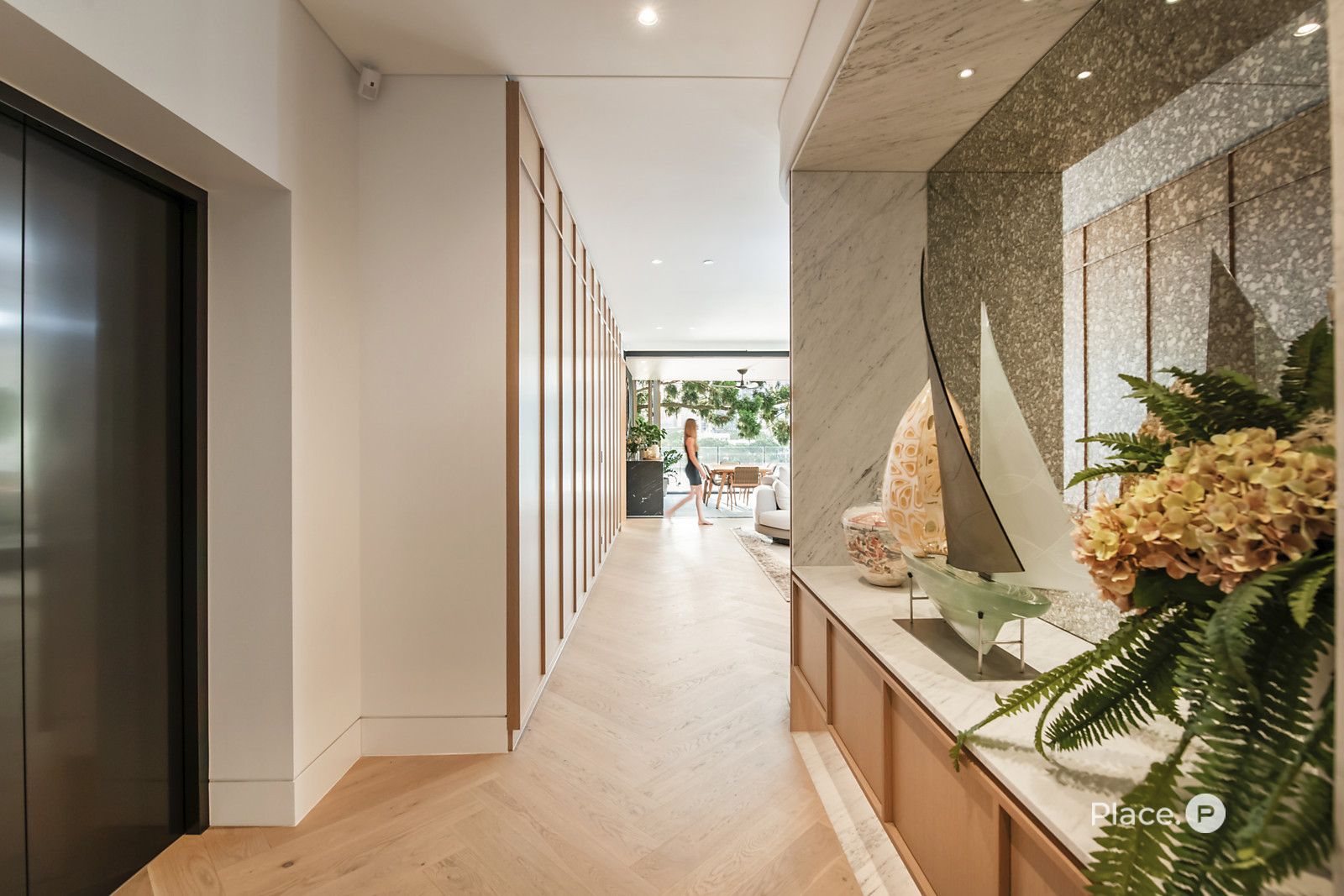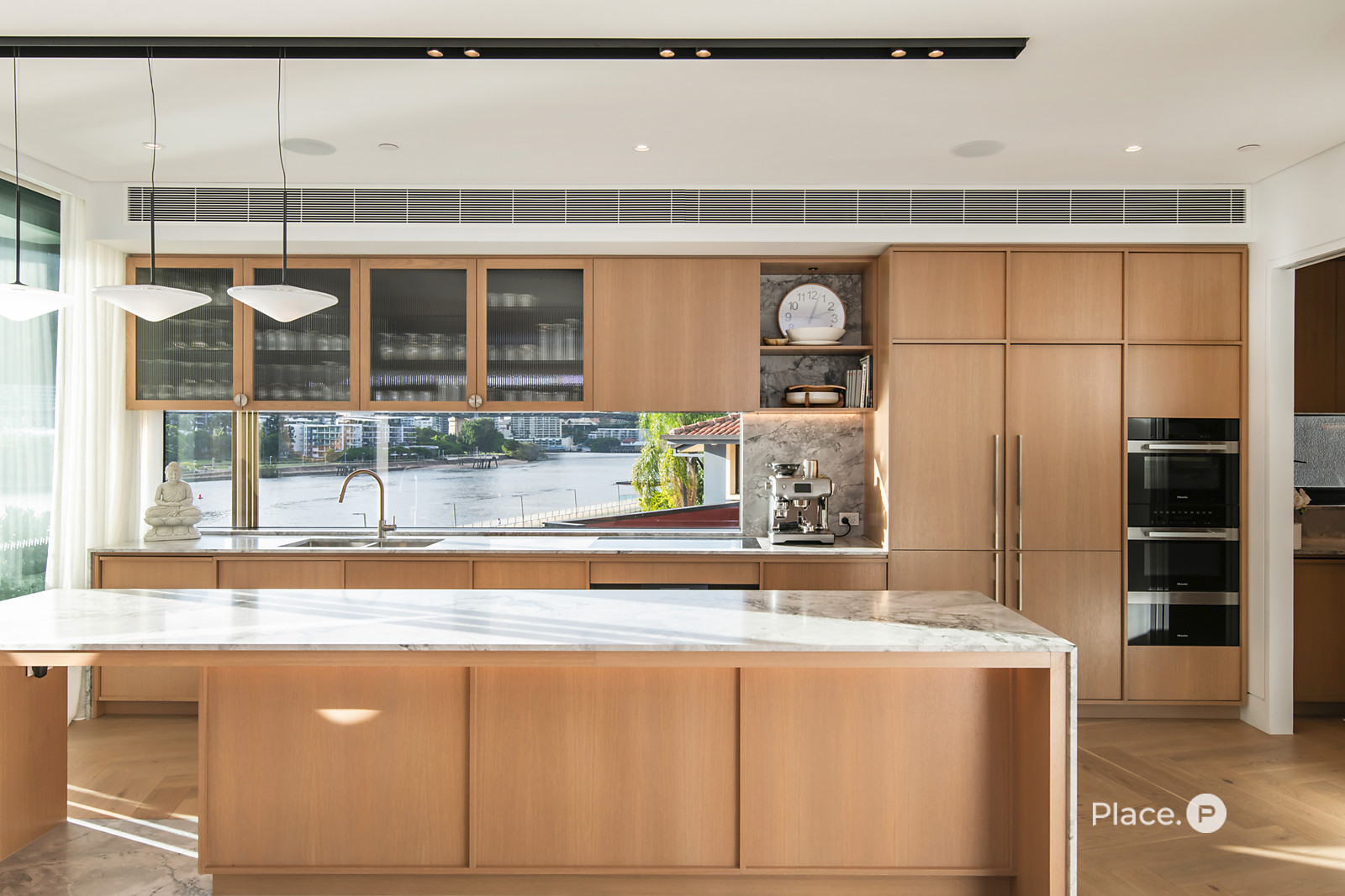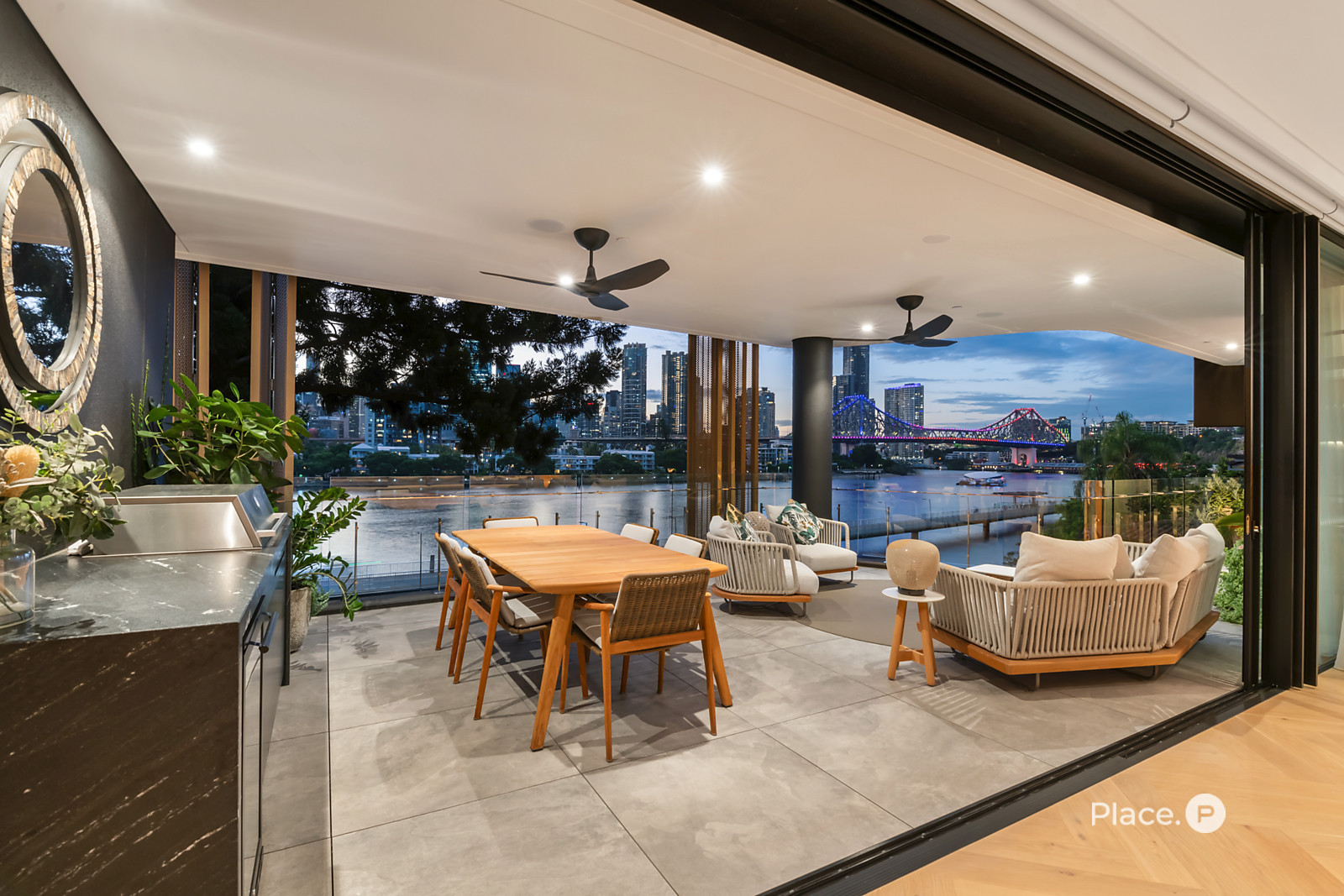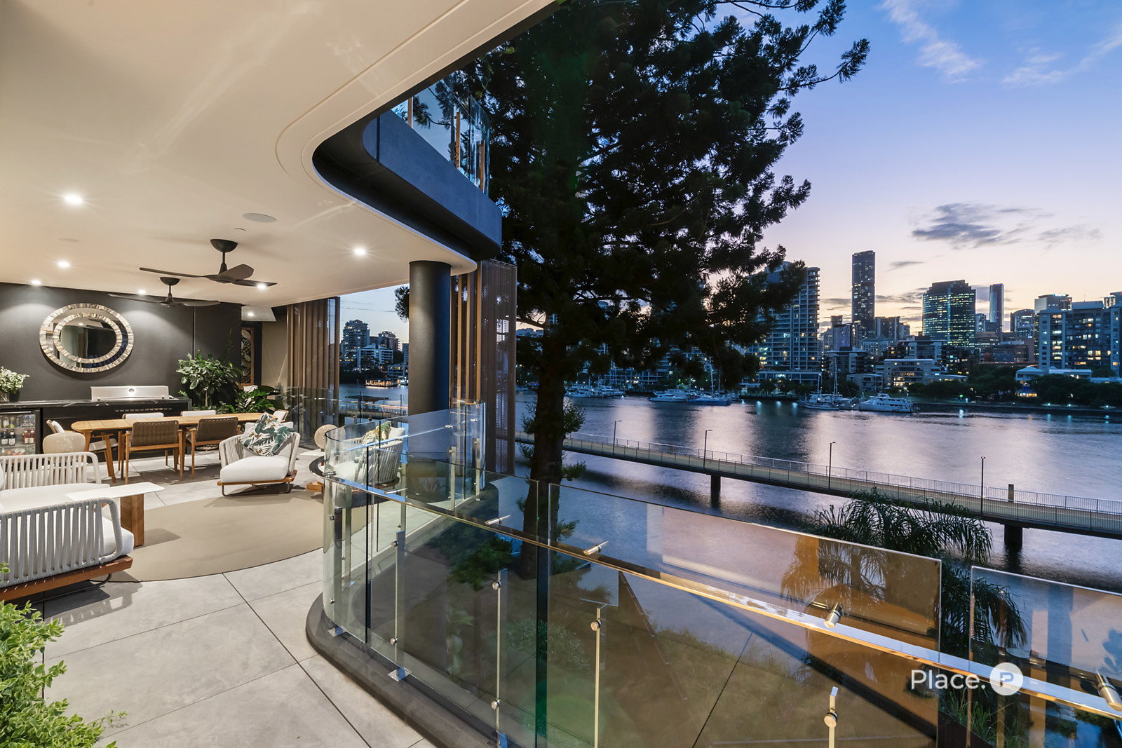 Timeless and refined, the residence spanning approx. 326sqm is ideally positioned on a coveted stretch of the Brisbane River. Framed by full-height glass that draws your eye to the mesmerising vista, the apartment also showcases exquisite herringbone timber floors and stone accents.