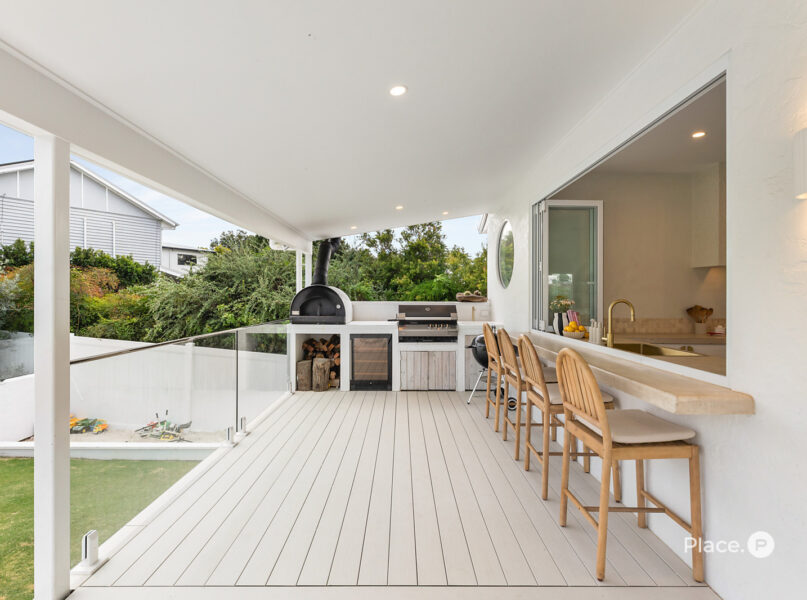 Flowing from the property’s welcoming entry and front verandah, a spacious open-plan living and dining area is made warm and inviting by a charming fireplace. Also featuring an integrated wet bar, this sophisticated central space adjoins a brilliant gourmet kitchen displaying a large breakfast bar, 60-millimetre-thick concrete benchtops, a butler’s pantry, a servery window and ample cupboard storage. A suite of premium appliances includes a five-burner gas cooktop with an overhead tap.