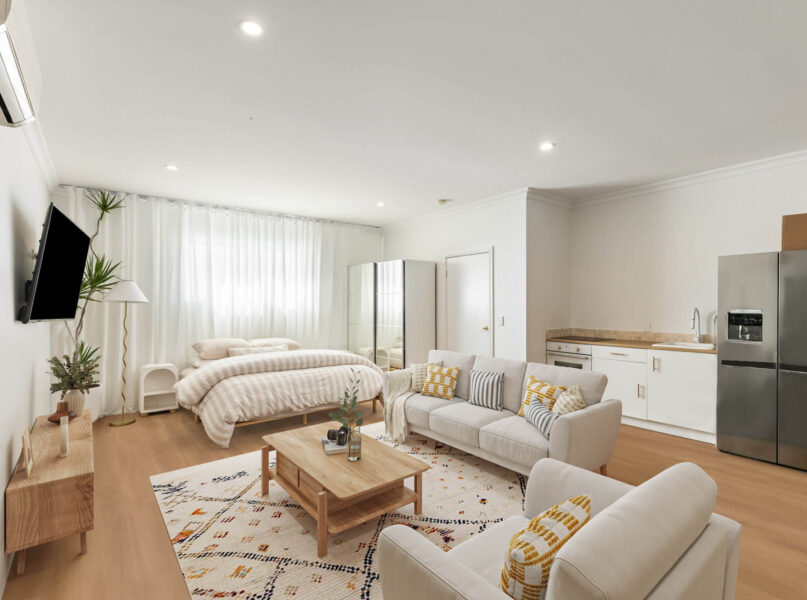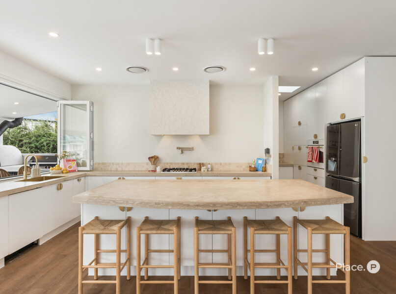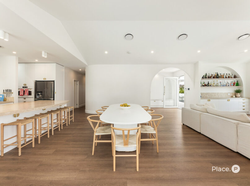 An enviable modern retreat, the residence will impress from the outset with its striking contemporary facade, gated entry and established front gardens. Capturing spectacular natural light, the home’s interior showcases exquisite timber floors, lofty 2.7-metre-high ceilings, louvered windows and a crisp white colour palette.