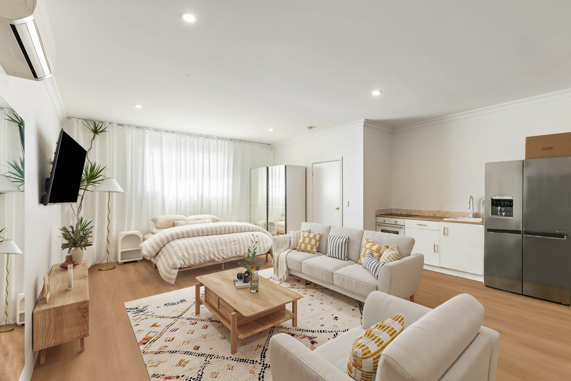 An enviable modern retreat, the residence will impress from the outset with its striking contemporary facade, gated entry and established front gardens. Capturing spectacular natural light, the home’s interior showcases exquisite timber floors, lofty 2.7-metre-high ceilings, louvered windows and a crisp white colour palette.