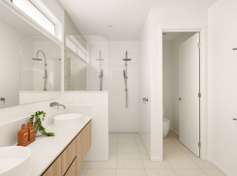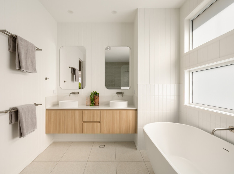 Looking out over the beautiful rear yard below, an opulent master suite boasts a walk-in robe. A connecting ensuite is made wonderfully luxurious by dual vanities, floor-to-ceiling tiling and a large frameless shower. Three additional bedrooms with built-in robes are serviced by a well-appointed main bathroom, which has a separate bath and shower.