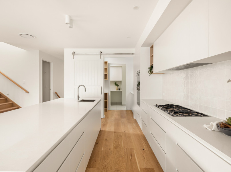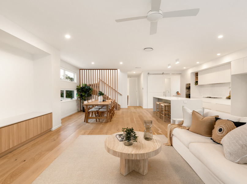 Benefitting from an intelligent layout, the residence flows from its welcoming entry to a spacious open-plan living and dining area on the ground level. Accented by integrated joinery, this refined central space adjoins a fantastic kitchen displaying a breakfast bar, a butler’s pantry, quality appliances and ample cupboard storage.
