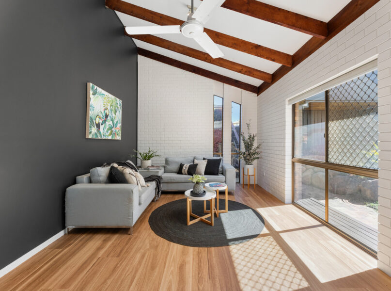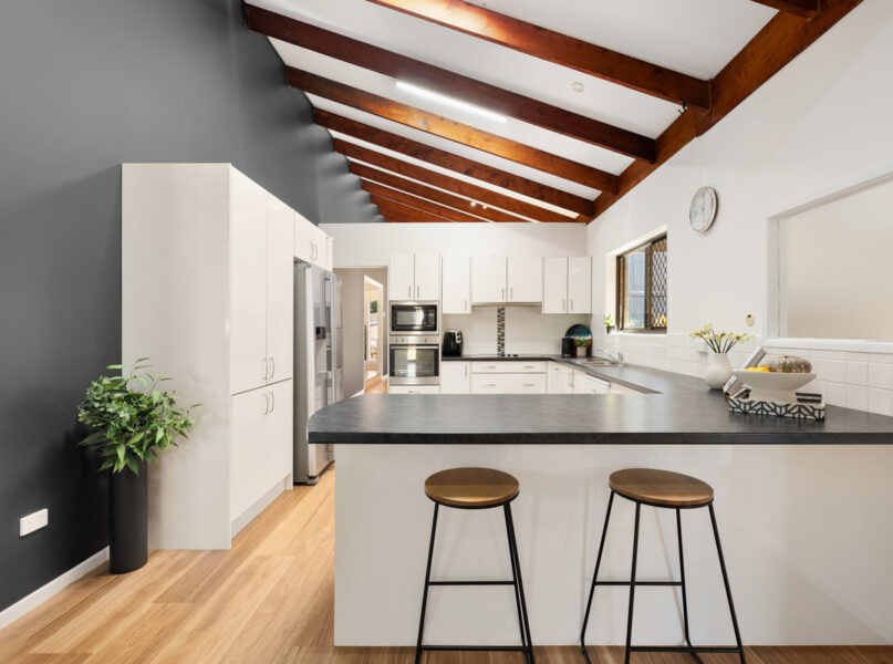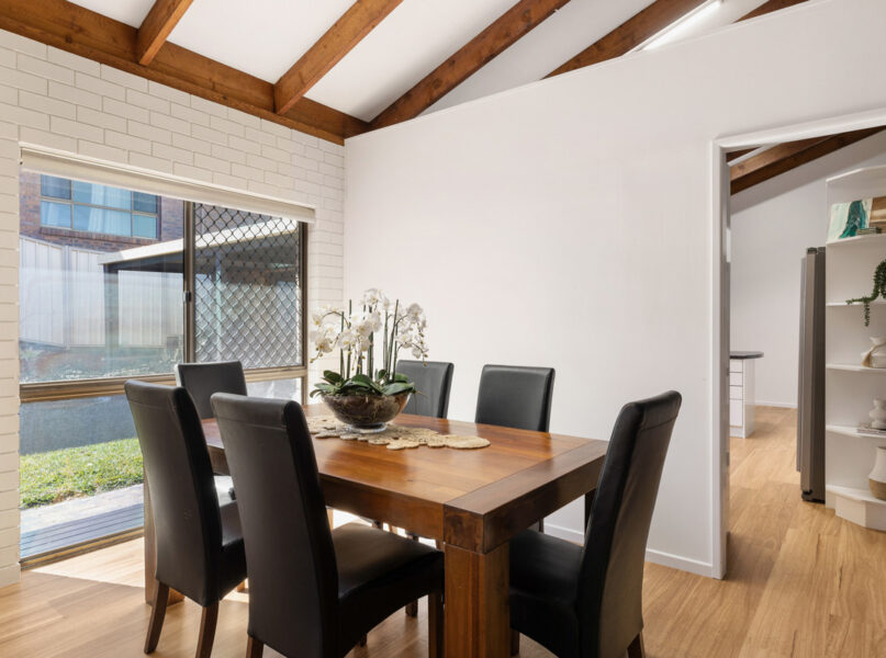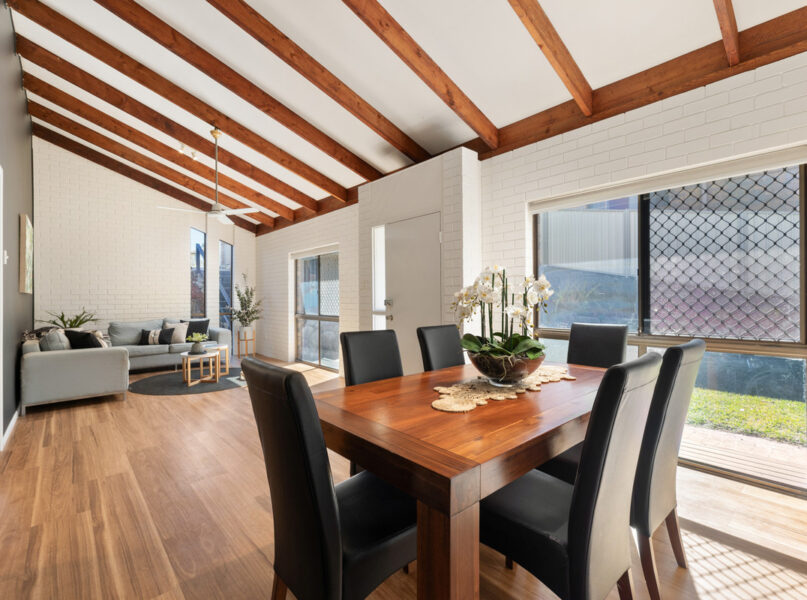Showcasing a classic brick facade and established front gardens, the home also features attractive timber floors and a versatile neutral colour palette. Lofty raked ceilings with exposed timber beams create a sense of grandeur, while also maximising natural light.