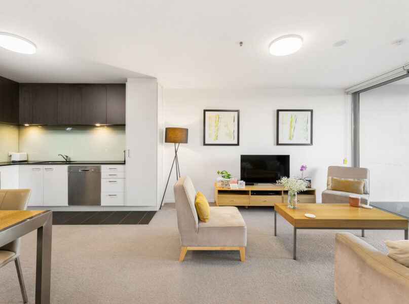 Modern in its aesthetic, the apartment showcases attractive carpeted floors and a versatile neutral colour palette. Full-height glass invites natural light to flow throughout the property, while also highlighting picturesque district and city views.