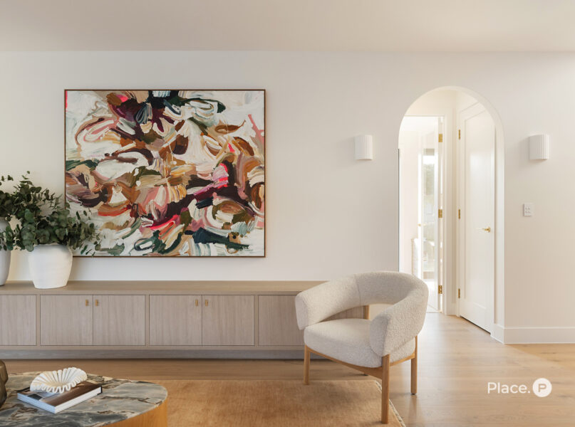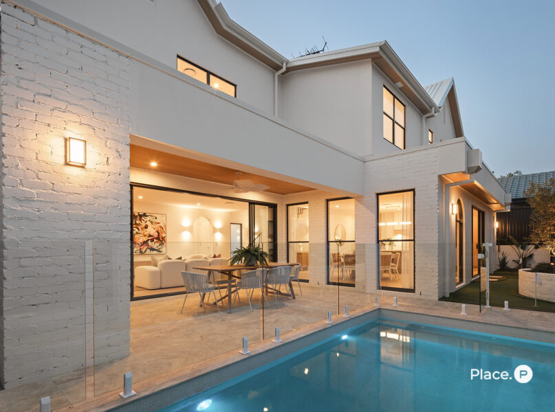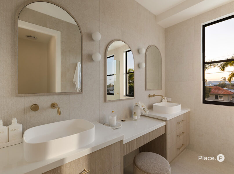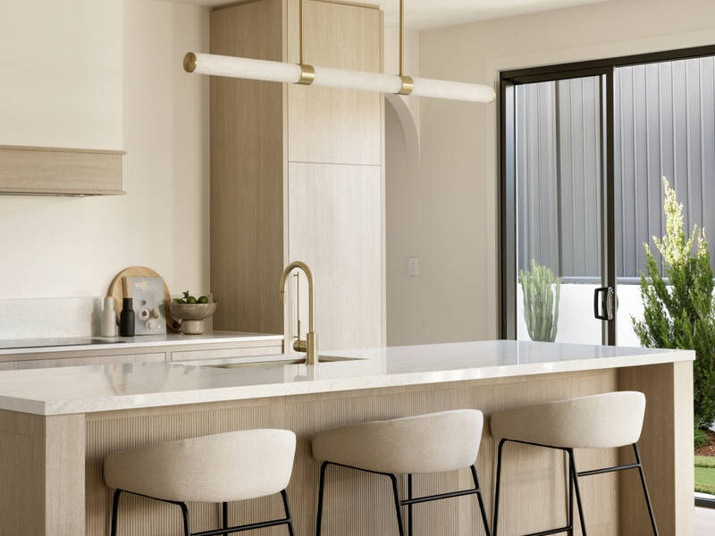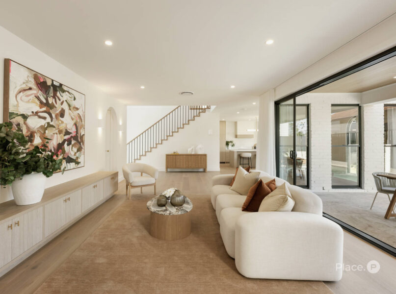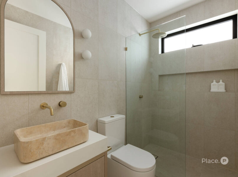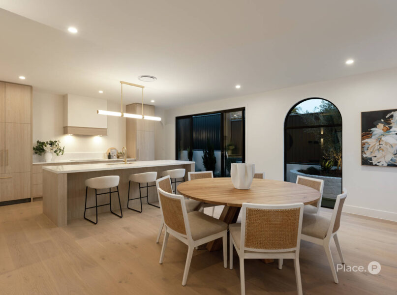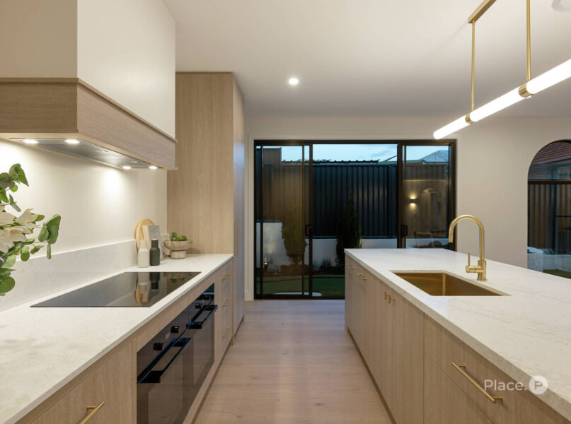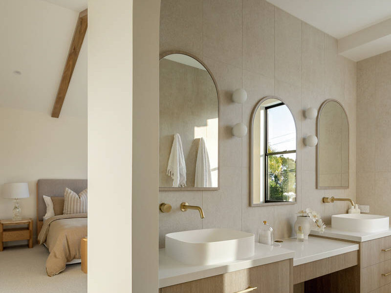 The kitchen is a culinary dream, anchored around an oversized island benchtop featuring exquisite Perla Vernata stonework. Featuring integrated fridge and freezer, and top-of-the-line Miele appliances. Brushed brass furnishings accentuate the home’s refined aesthetic, while the white truffle stone tops and travertine that lie throughout the bathrooms elevate the sense of opulence.