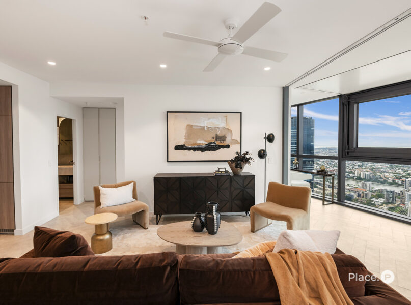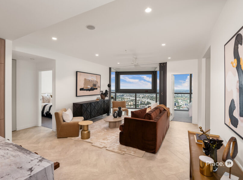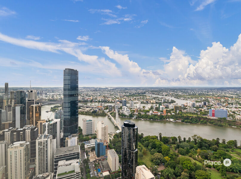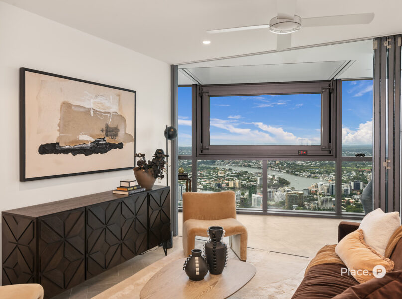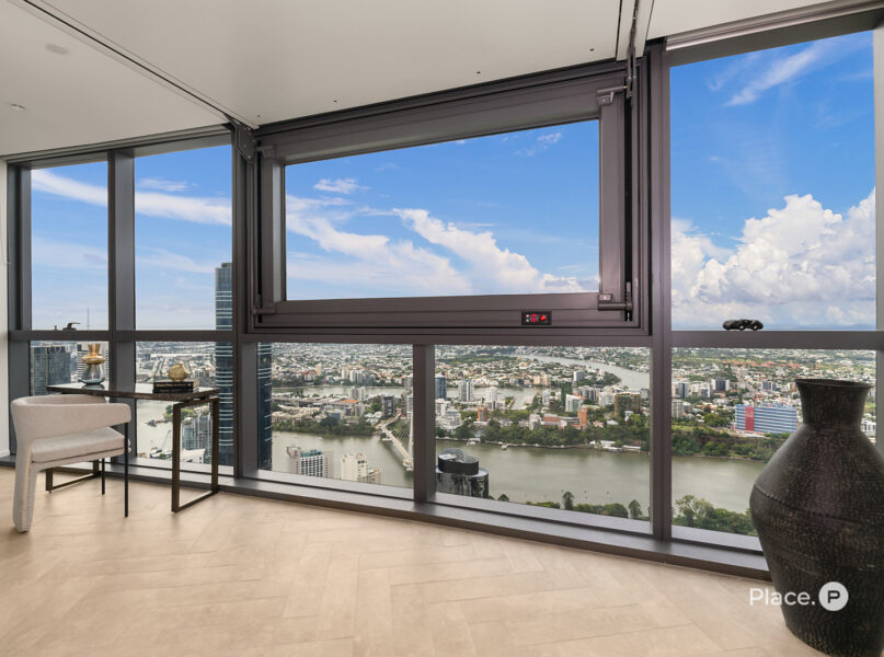 Looking out across the glittering city skyline, the meandering Brisbane River, the tree-dotted City Botanic Gardens and magnificent mountains beyond, this sensational abode sits above the rest, perched high on the top floor of the newly completed Queens Wharf Residences.