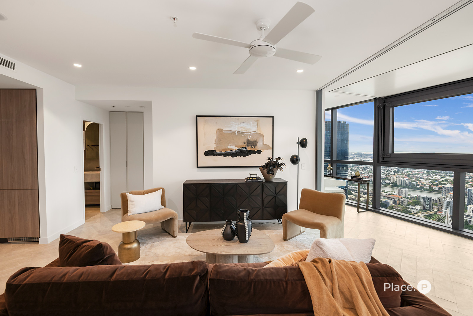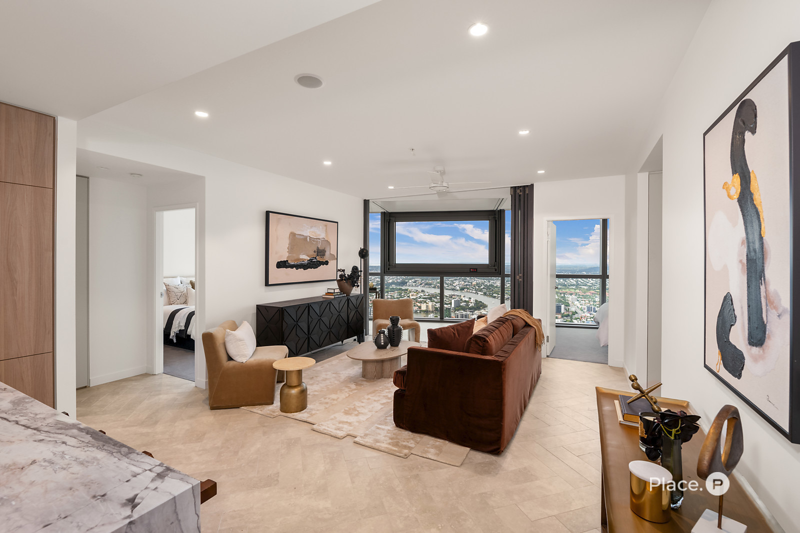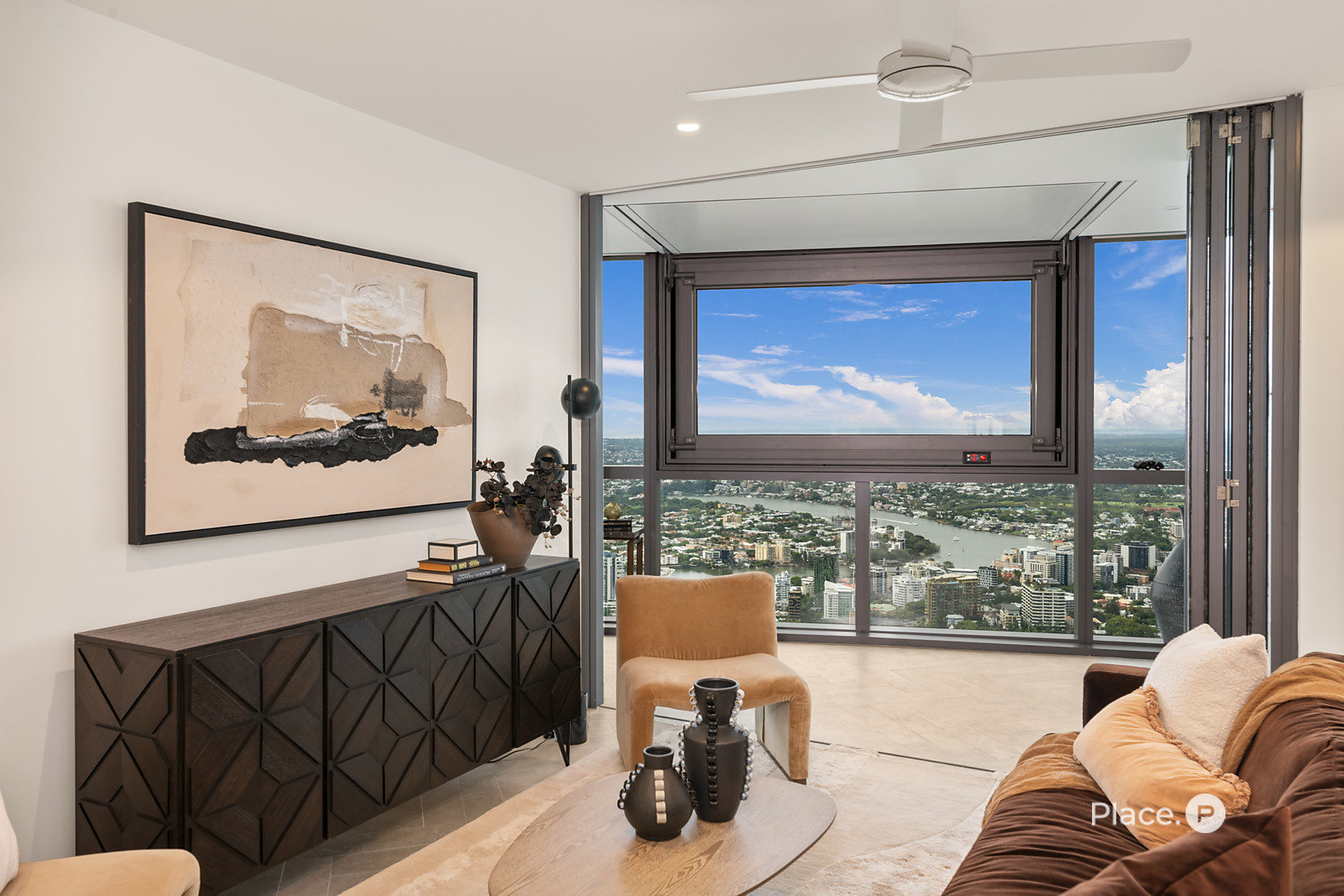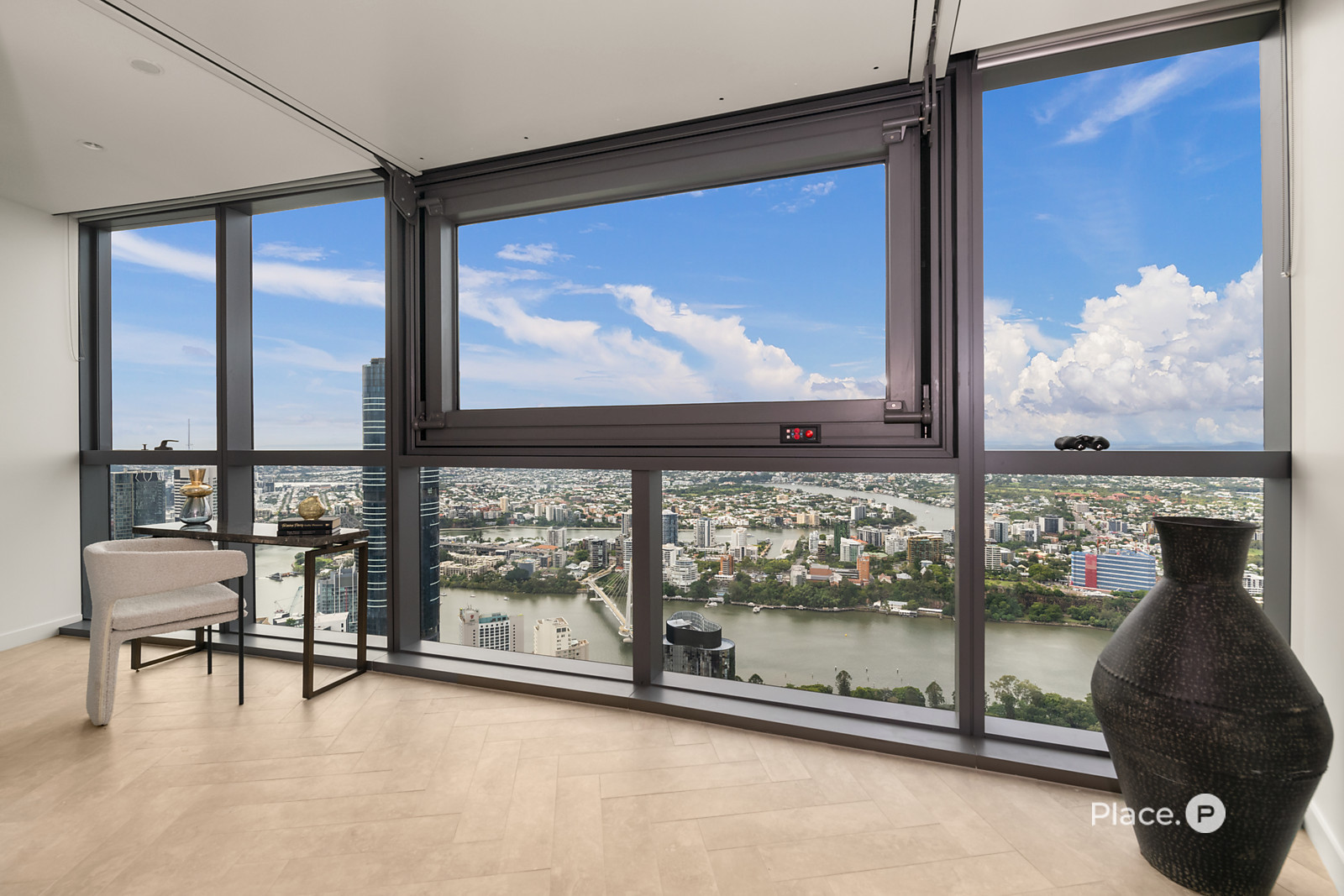 Looking out across the glittering city skyline, the meandering Brisbane River, the tree-dotted City Botanic Gardens and magnificent mountains beyond, this sensational abode sits above the rest, perched high on the top floor of the newly completed Queens Wharf Residences.