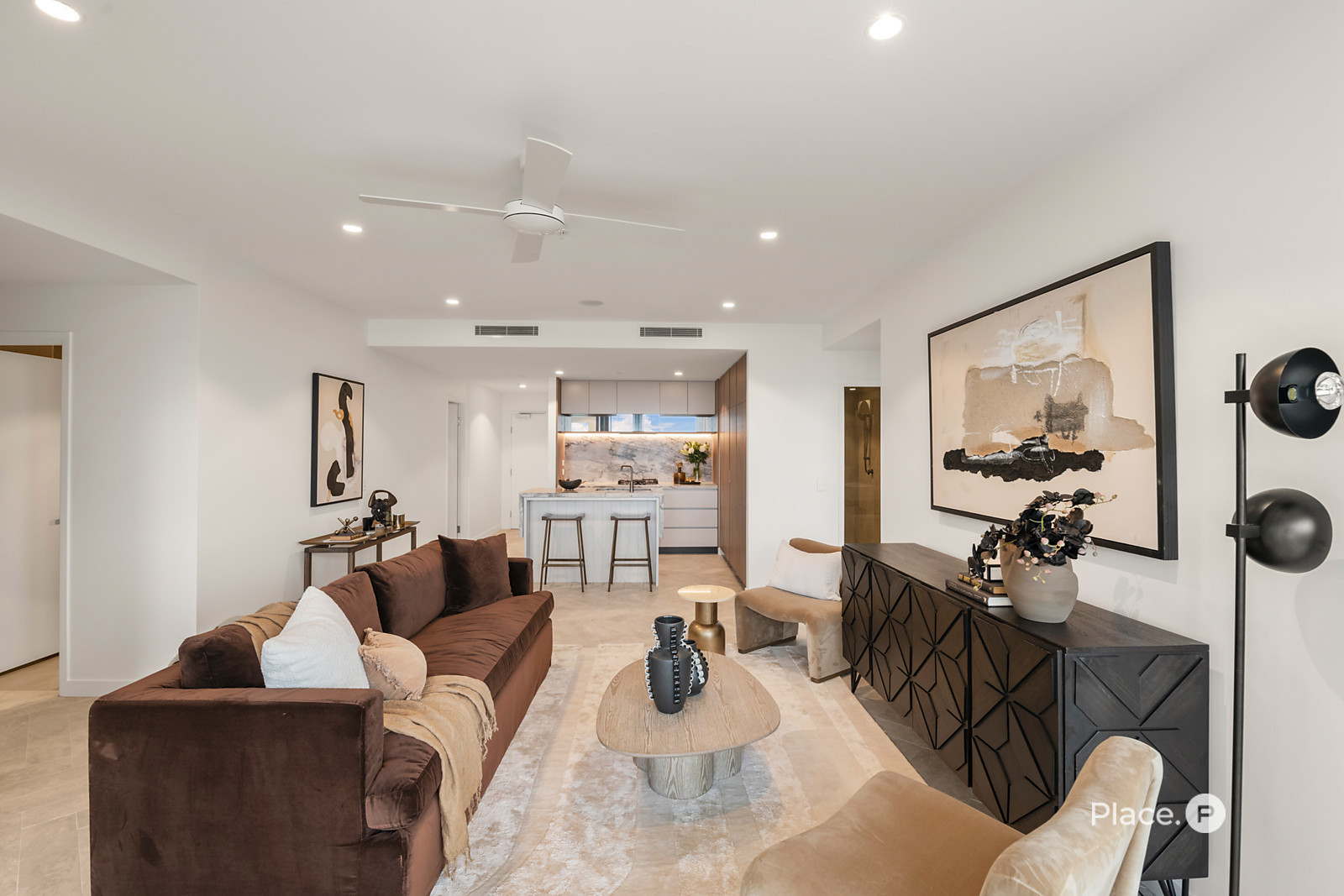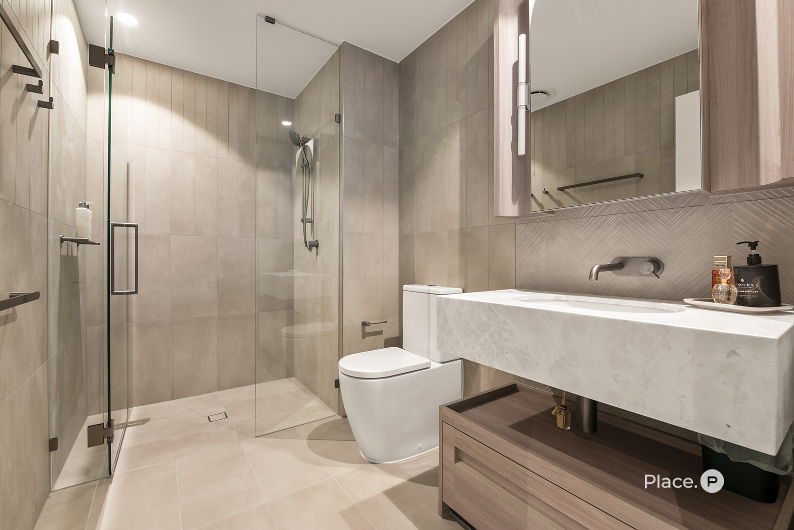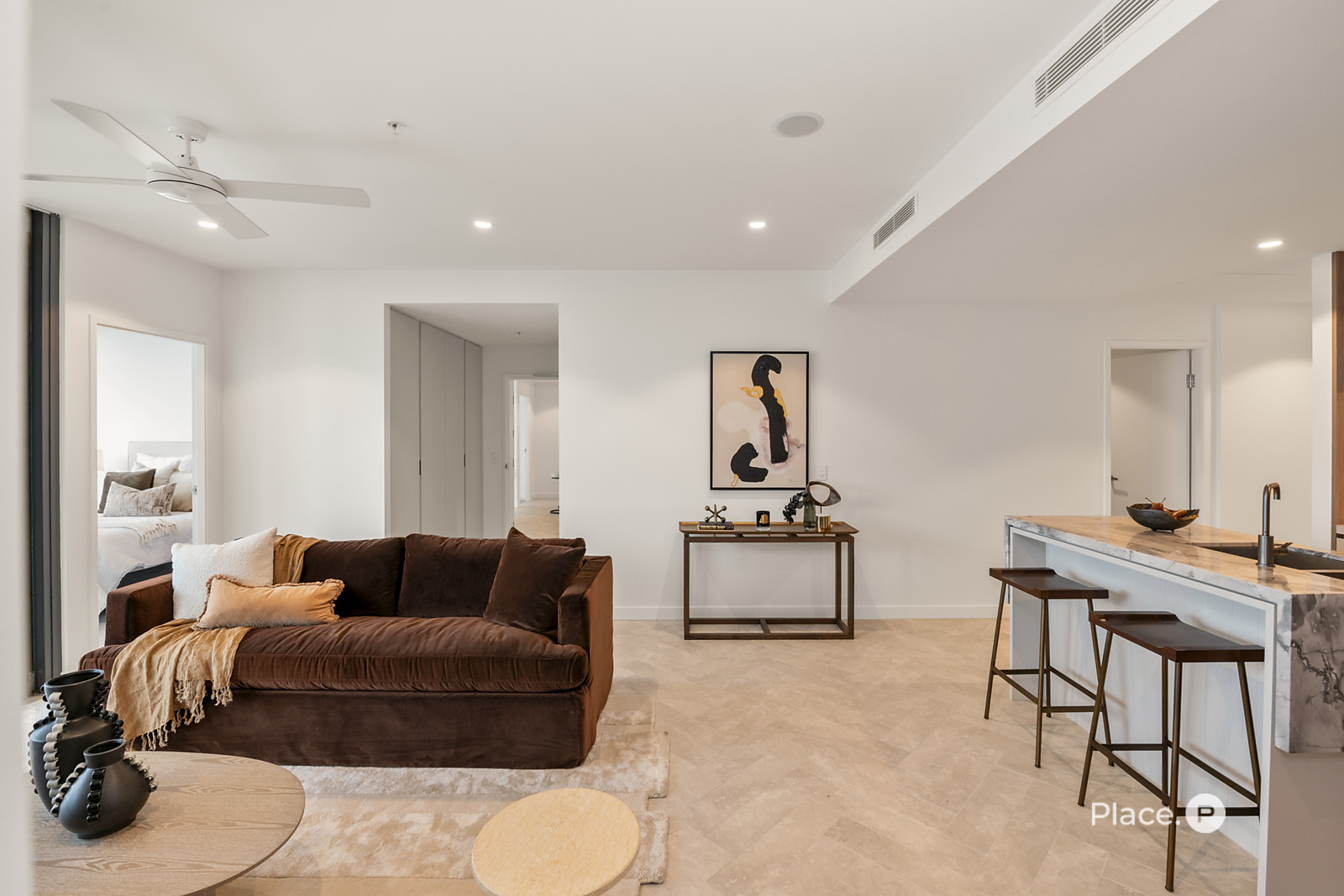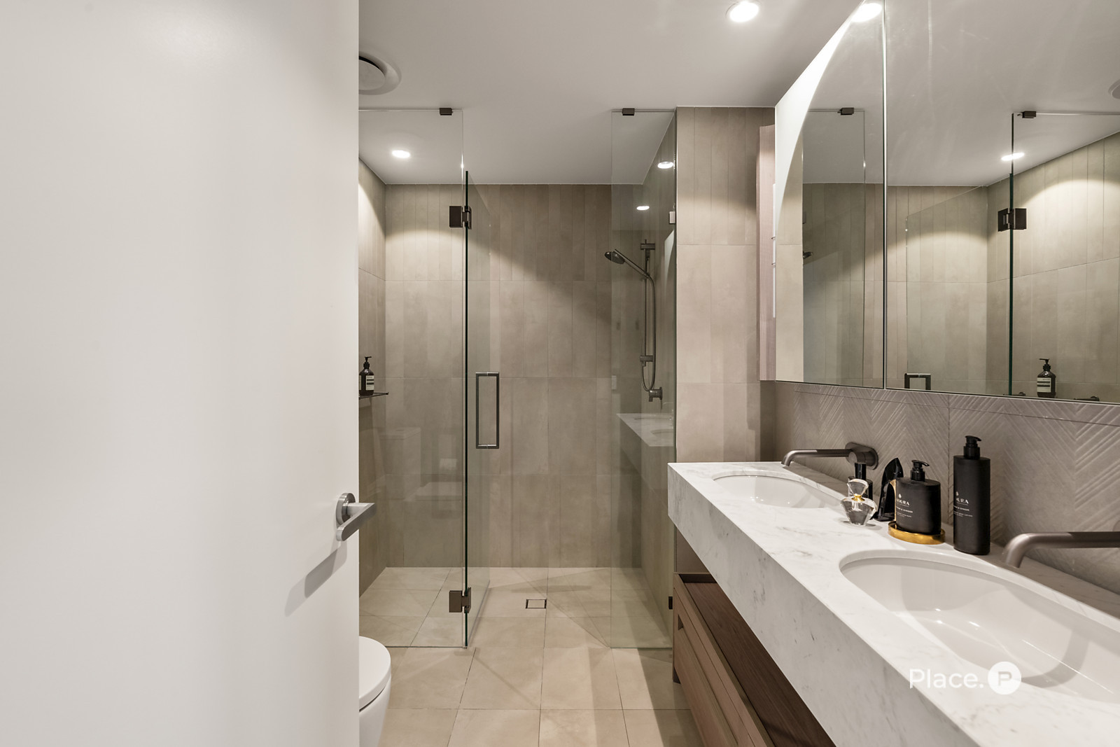The apartment features spacious open-plan living and dining areas, as well as an enclosed balcony with breathtaking outlooks and plentiful entertainment space. Glass bi-fold doors blur the lines between the central living zones and the al fresco areas, ensuring seamless connection.