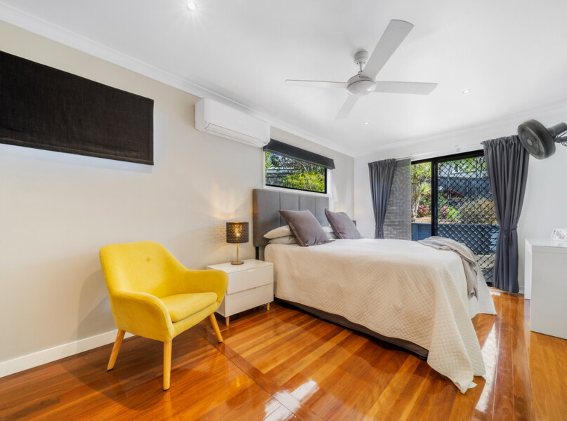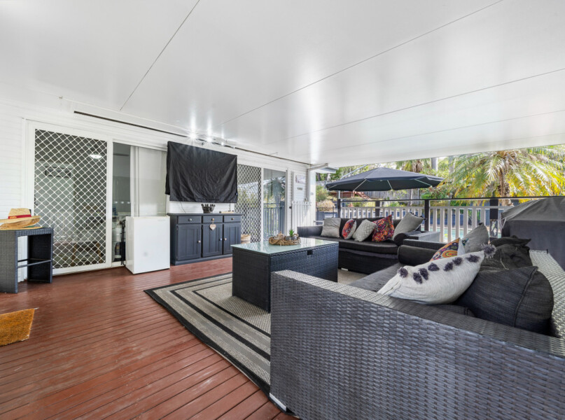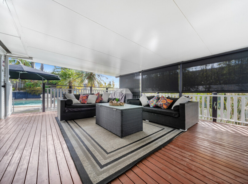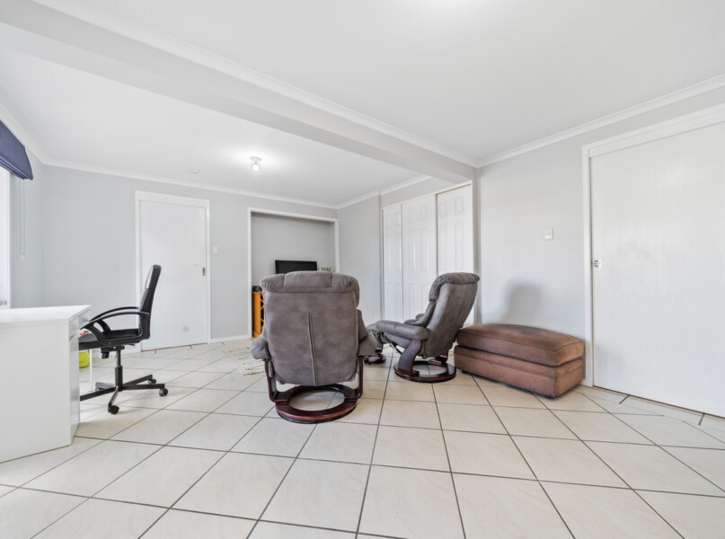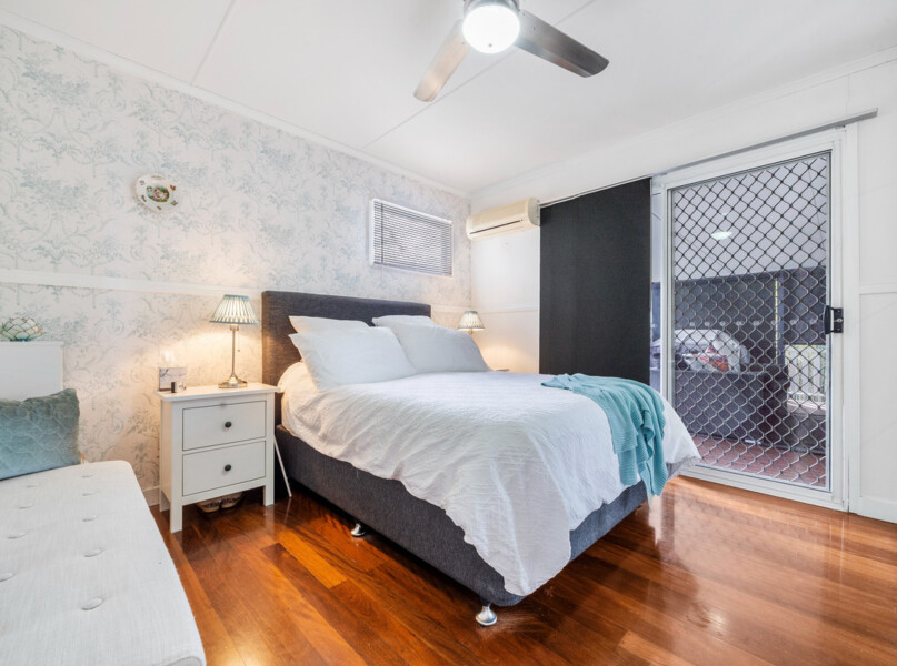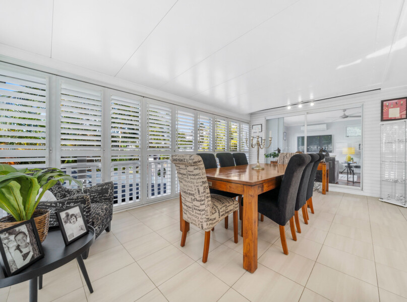 As you enter the dining area, you’re greeted by the embrace of plantation shutters, creating an inviting and stylish atmosphere. The adjacent lounge offers both comfort and functionality, boasting a ceiling fan and a Panasonic split-system air conditioning unit to keep you cool and comfortable.
