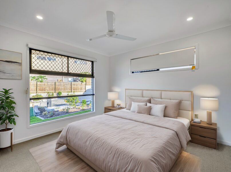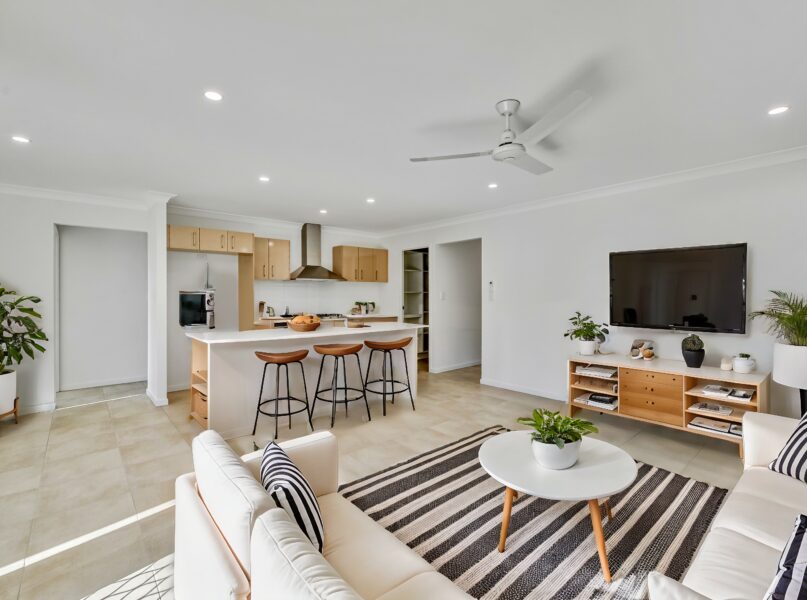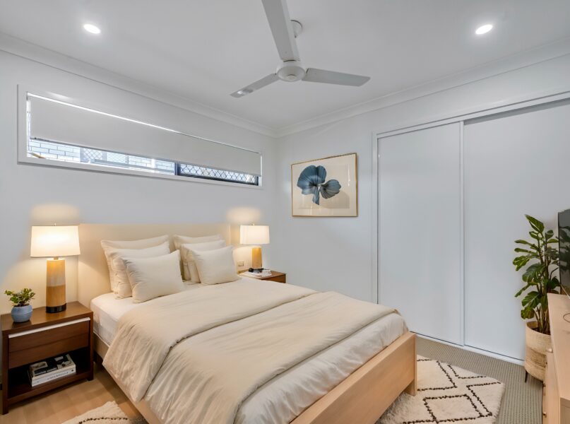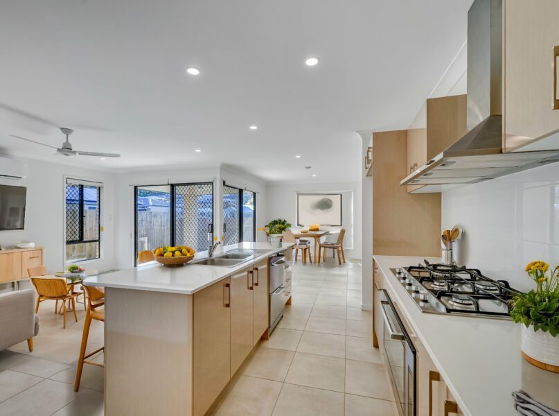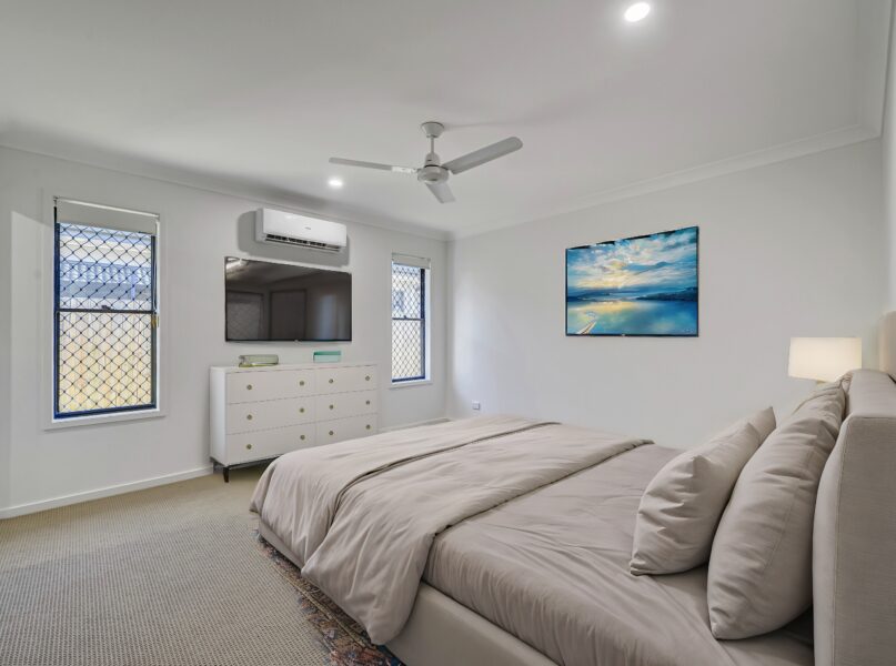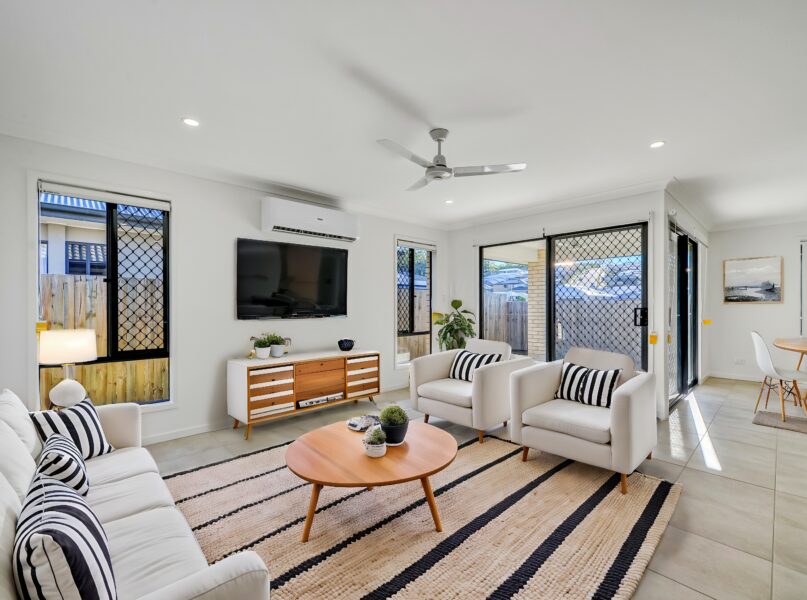 This home’s impeccable attention to detail is evident in every room. From the stylish white plantation shutters to the two-toned kitchen cabinetry and expansive breakfast bar, no expense has been spared in creating a truly exceptional living space. The light-filled open-plan living and dining area off the kitchen is air-conditioned for year-round comfort and extends out to a covered patio area, perfect for alfresco dining or simply enjoying the beautifully landscaped, pet-friendly fenced yard.