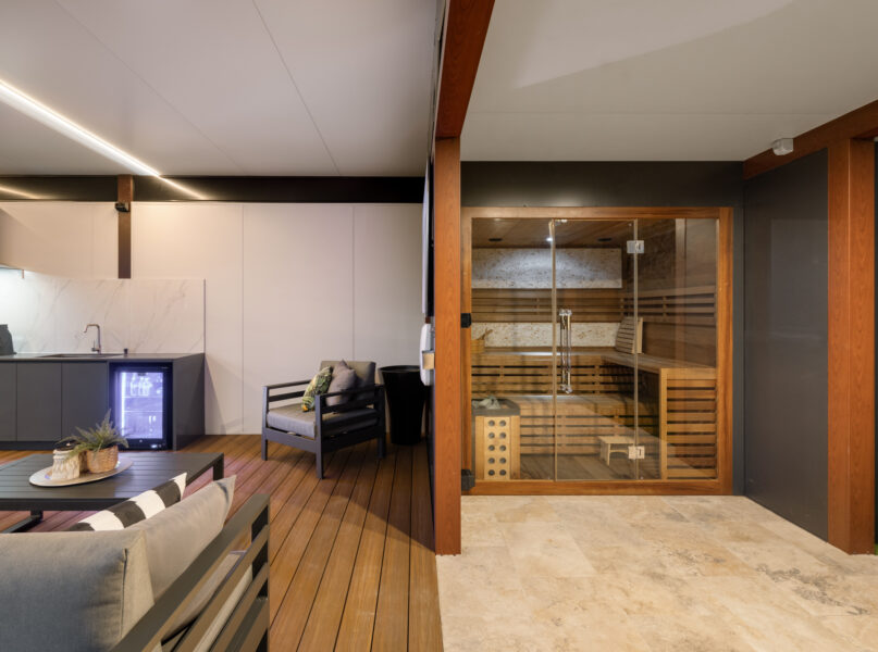 In addition to its versatile living options, the property’s spectacular outdoor area will exceed the highest of expectations. An expansive fully-fenced grassed rear yard dotted with mature greenery offers vast amounts of space for children and pets, while a glass-framed in-ground swimming pool invites you to cool off in sheer luxury. Lending itself to both grand and intimate gatherings, a covered pool house has a full outdoor kitchen with an integrated barbecue, a built-in drinks fridge and stone benchtops. Steps away is an enviable four-person sauna, as well as a full bathroom. A 12×6-metre gazebo extends the residence’s relaxation and entertainment options.