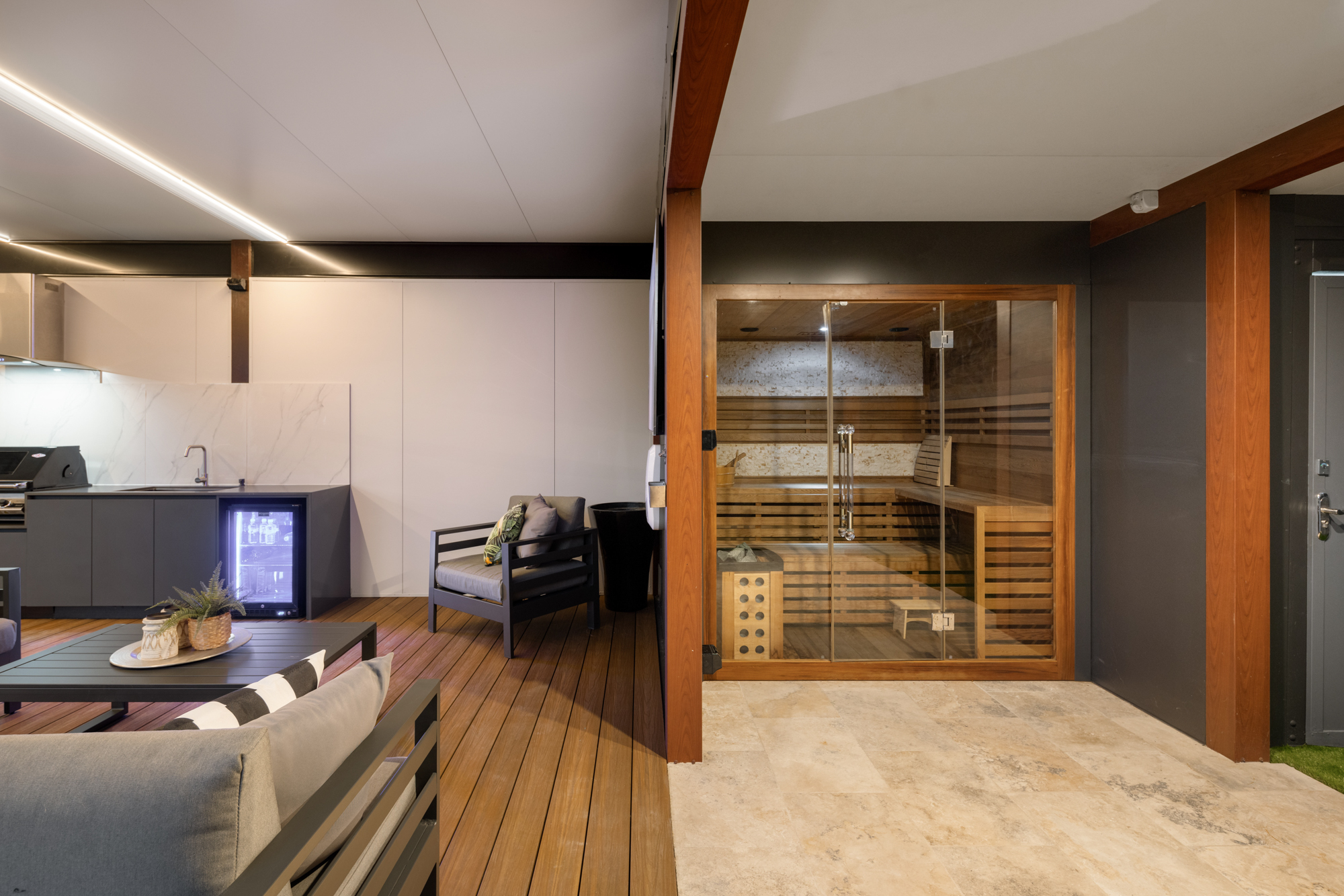 In addition to its versatile living options, the property’s spectacular outdoor area will exceed the highest of expectations. An expansive fully-fenced grassed rear yard dotted with mature greenery offers vast amounts of space for children and pets, while a glass-framed in-ground swimming pool invites you to cool off in sheer luxury. Lending itself to both grand and intimate gatherings, a covered pool house has a full outdoor kitchen with an integrated barbecue, a built-in drinks fridge and stone benchtops. Steps away is an enviable four-person sauna, as well as a full bathroom. A 12×6-metre gazebo extends the residence’s relaxation and entertainment options.