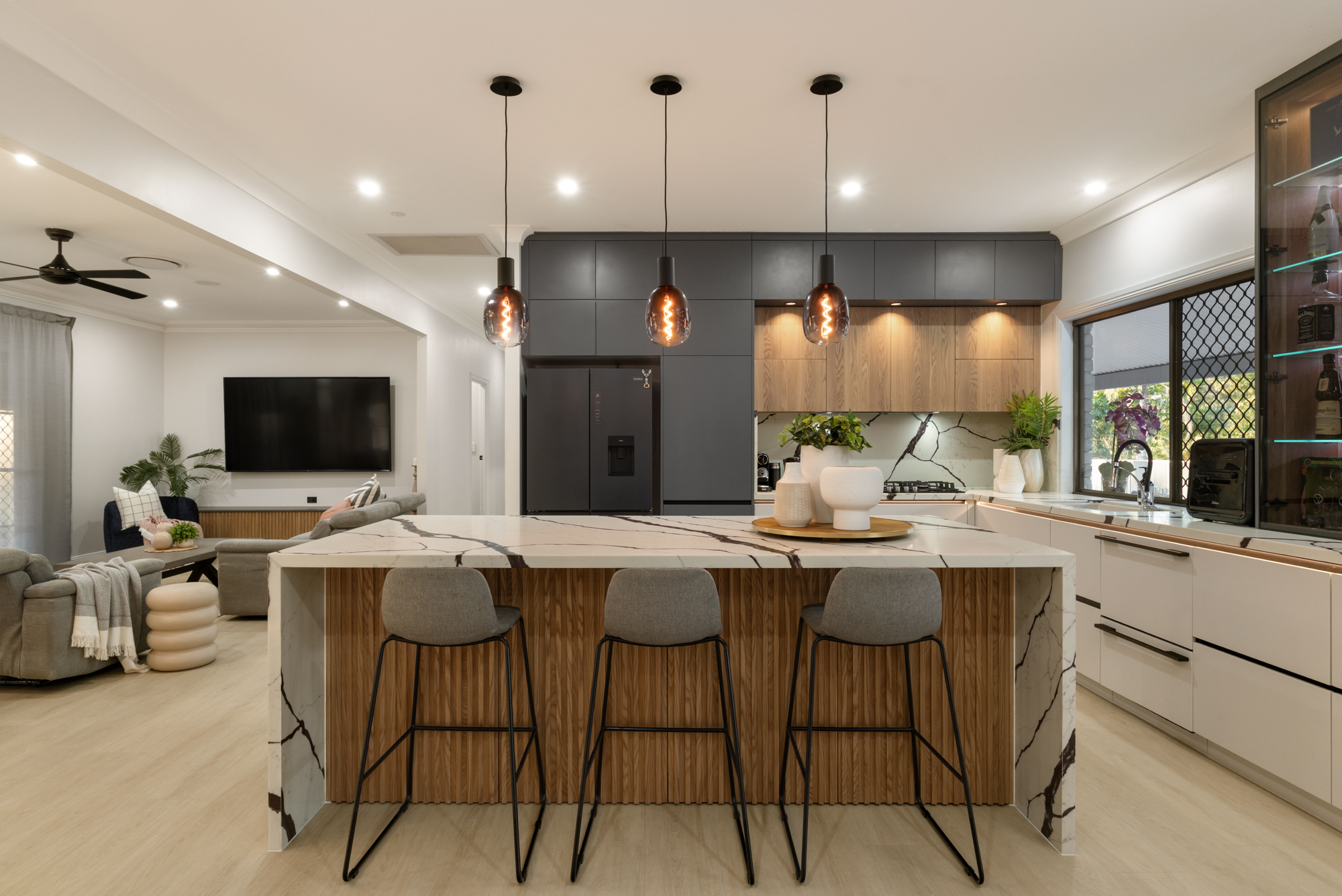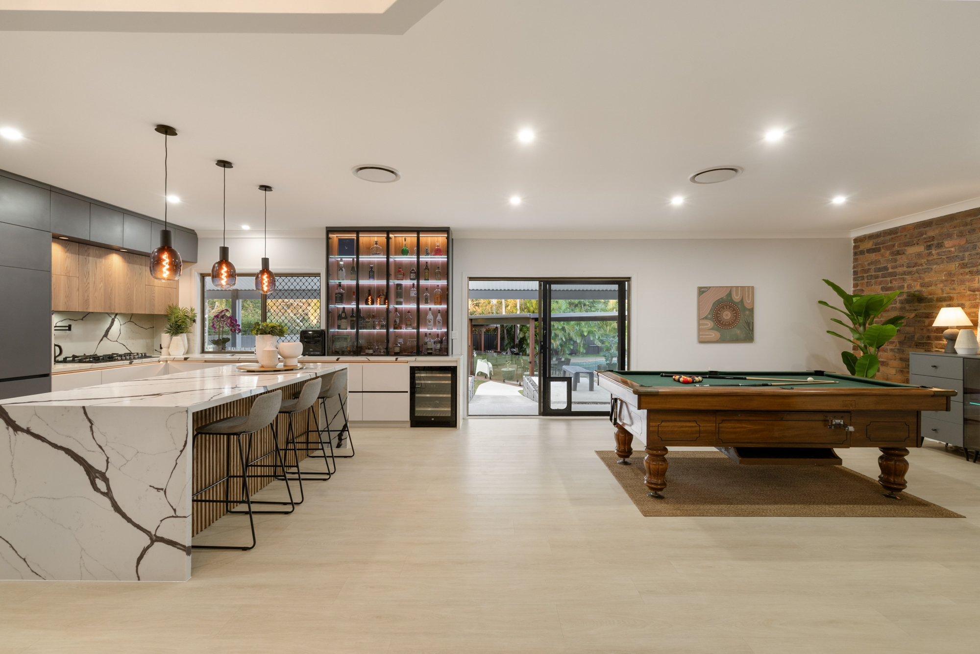 Awaiting families and entertainers alike, the main residence boasts a spacious open-plan living and dining area bathed in natural light. An impeccable adjoining kitchen displays quality appliances, a breakfast bar, pendant lights, stone benchtops and ample cupboard storage. There is also an impressive rumpus area and a wet bar, plus a covered al fresco area that you will love sharing with guests.