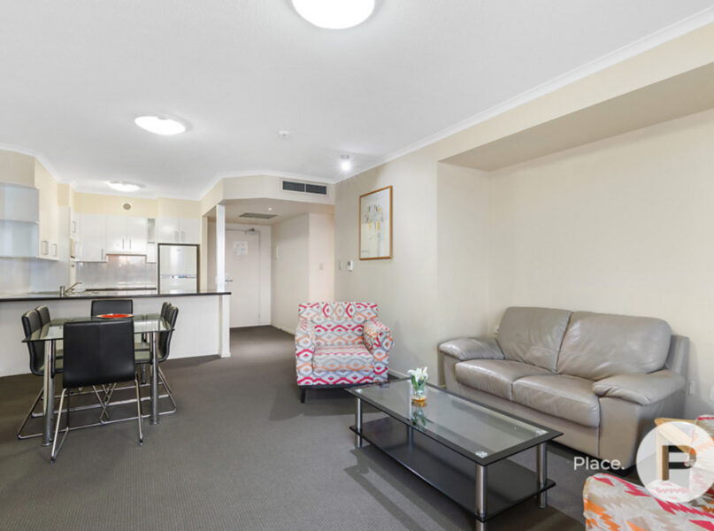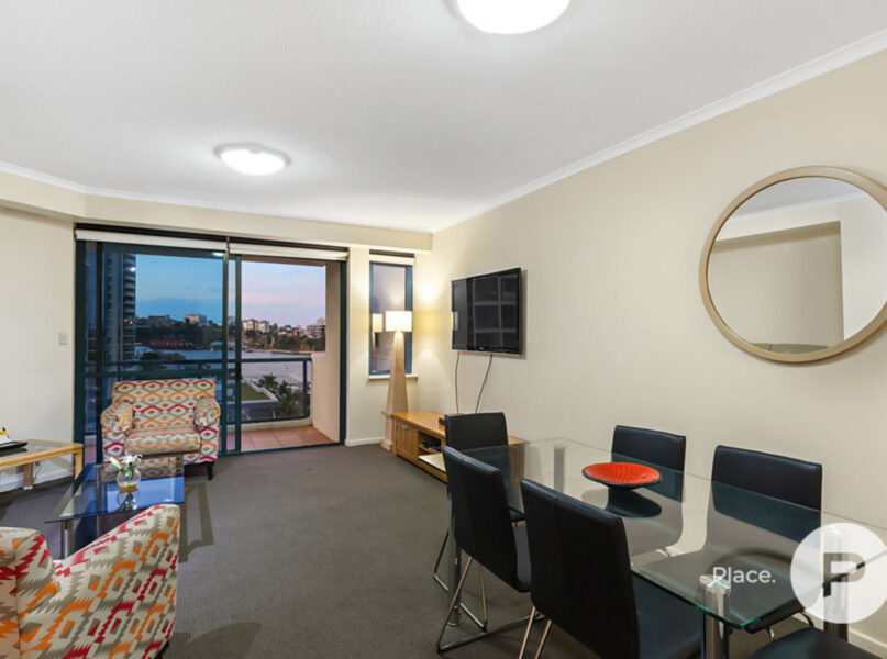 Capturing never-to-be-built-out views of the river and affluent New Farm beyond, the apartment features carpeted floors and a versatile neutral colour palette. Large glass sliding doors ensure fantastic airflow, while also highlighting the picturesque outlook.