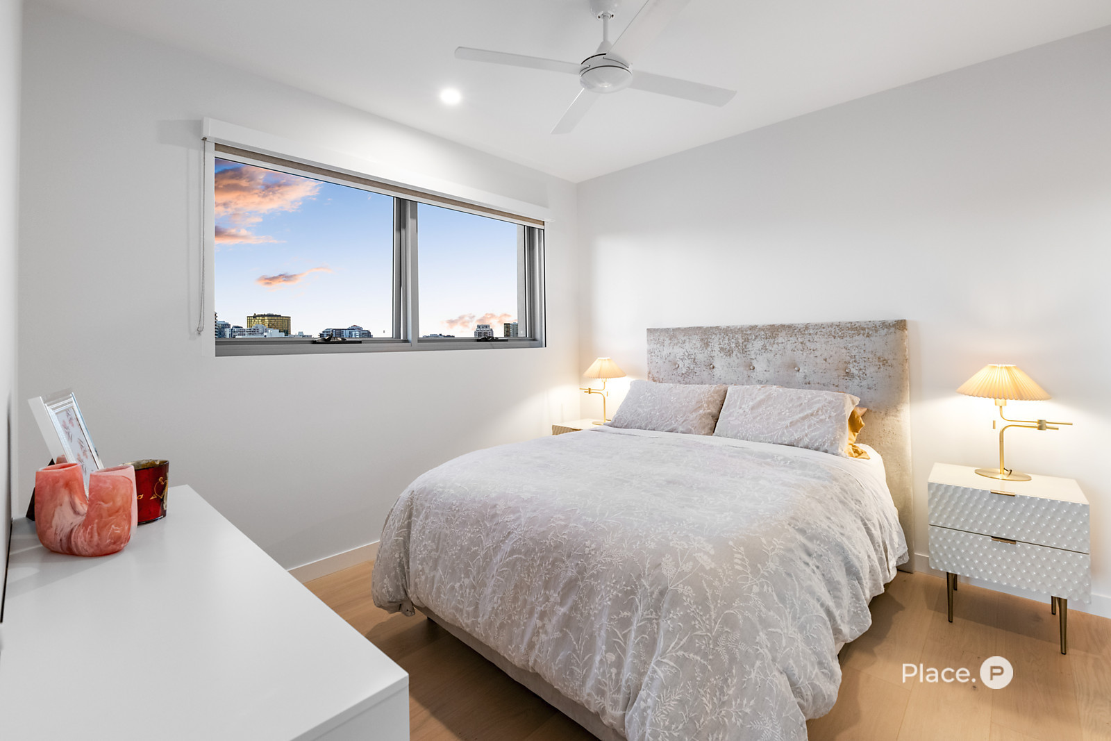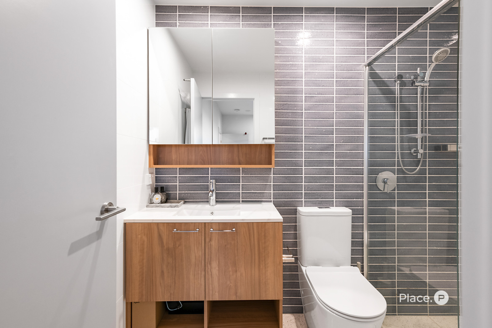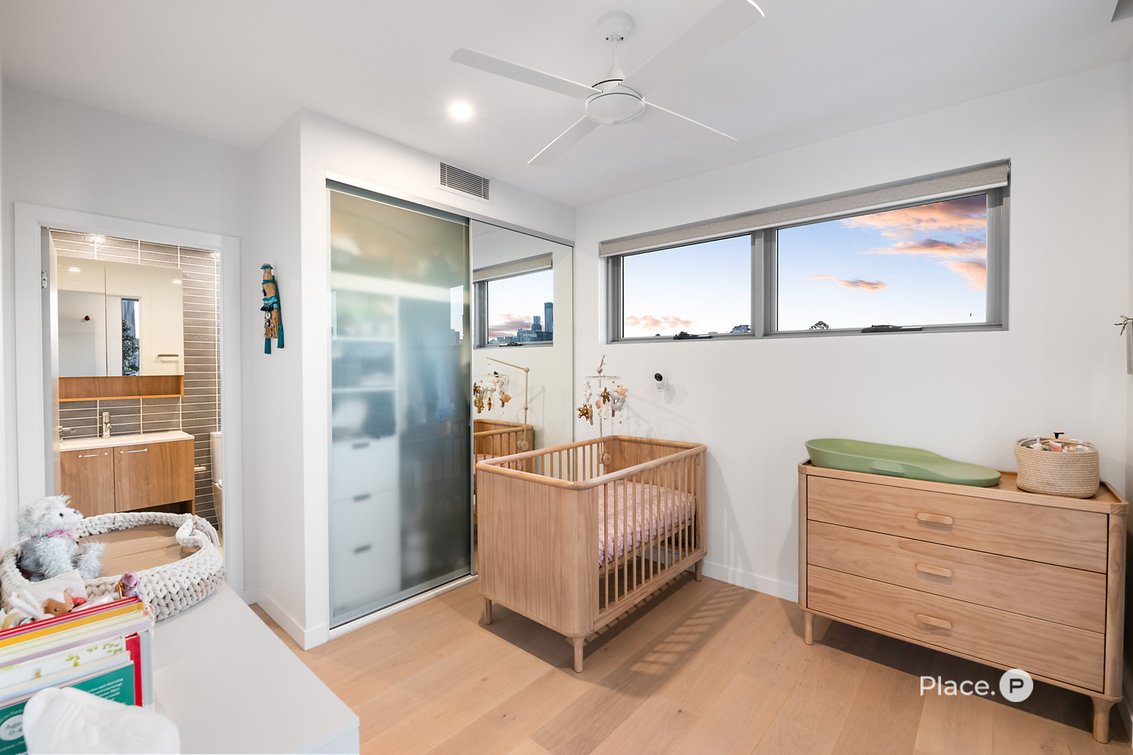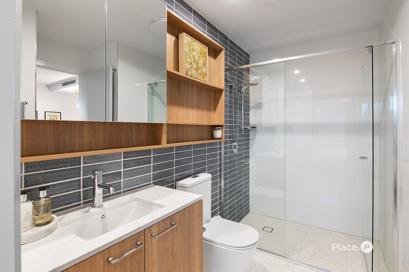 The master bedroom is a private retreat, complete with spectacular city views, large windows, custom-fitted wardrobes and a beautifully appointed ensuite with a frameless glass shower and floor-to-ceiling tiling. A cleverly conceived second bedroom, also city-facing, features a well-sized ensuite with smart wooden cabinetry, modern tapware, a frameless glass shower, and dual access for guest convenience and versatility.