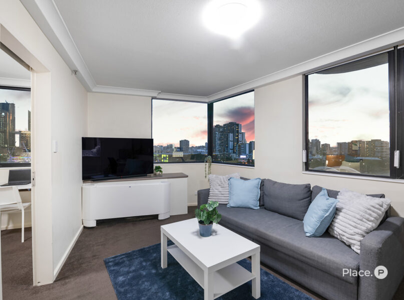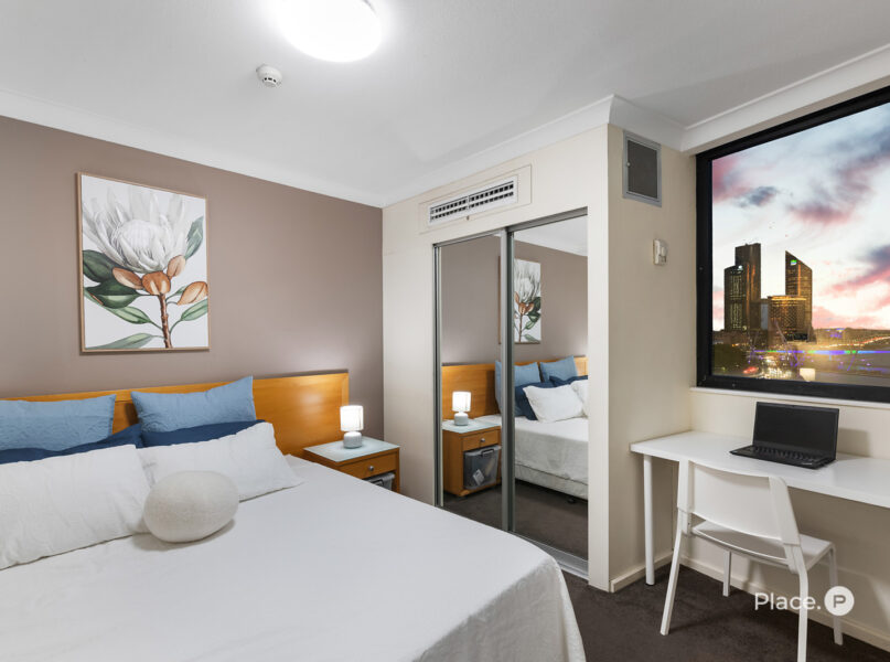 Occupying an enviable corner position on the seventh floor of Park Regis Hotel, this residence offers views that belie the size. Entering the main door leads guests to be transfixed by the moving palette of the city offered from the wide gallery windows running along two sides of the spacious open plan living area. The vista opens with wide views of from the Cultural Precinct – GOMA, Museum. Kurilpa footbridge down the river to Toowong and beyond.