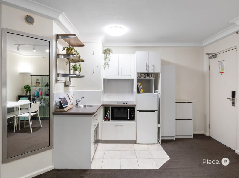 Serviced by a clean white, fuss free corner kitchen, neat and tidy with a place for everything tucked away prepare your dinner gazing at the view to the Goma. There’s space for the work from home occupant with a snook available in the bedroom or dine with a view – the choice is yours. One light and airy bathroom with large shower and crisp white vanity completes the suite.