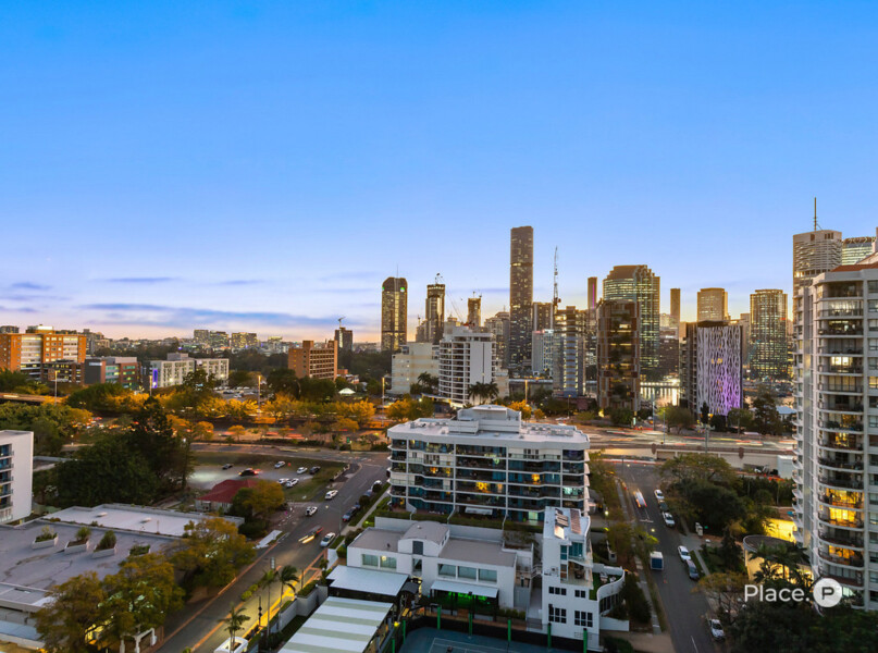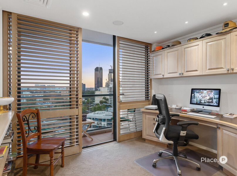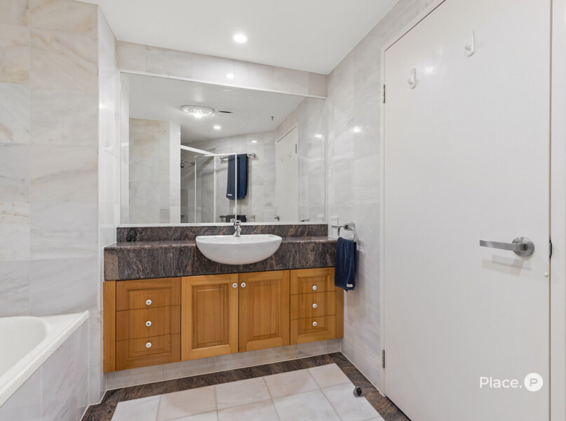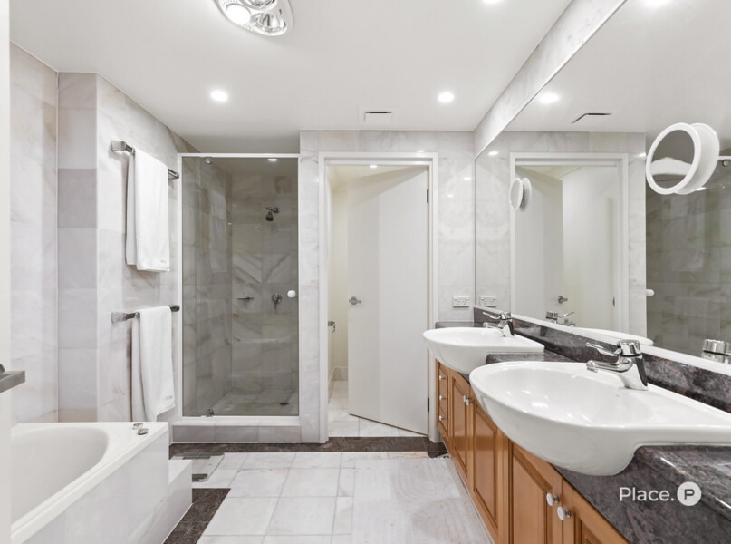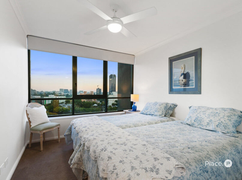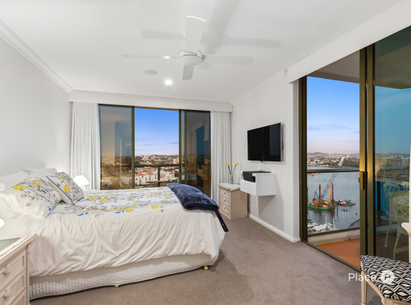 A master bedroom positioned on the eastern side of the residence has a balcony and uninterrupted views across to New Farm and down to Humbug Reach. It also has a walk-in robe and an ensuite including double basins, a separate toilet, shower and bath. The residence features another bedroom which enjoys stunning city views, built-in robes and access to a second bathroom.