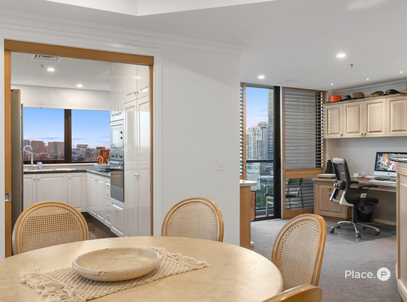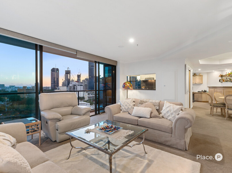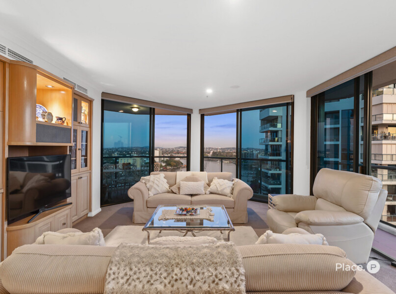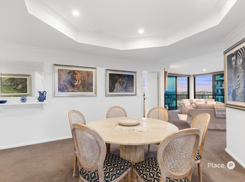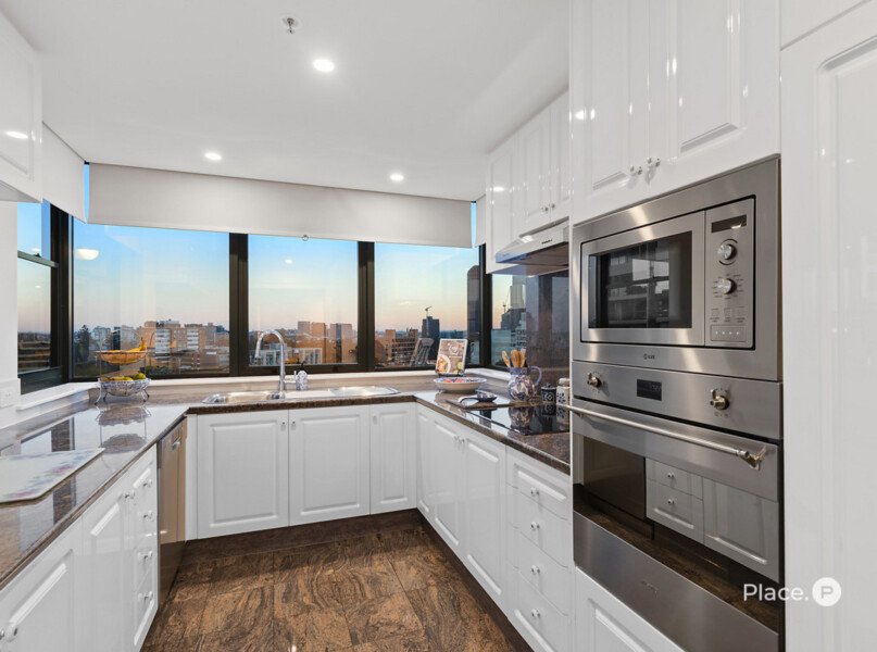 Greeting you upon entry, a spacious open-plan living and dining area provides plentiful space for spending time with loved ones. Blurring the lines between the indoors and outdoors, large glass sliding doors open out to a wrap-around balcony capturing spellbinding city, New Farm and river views.