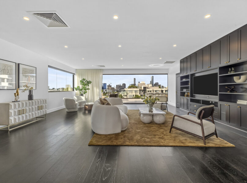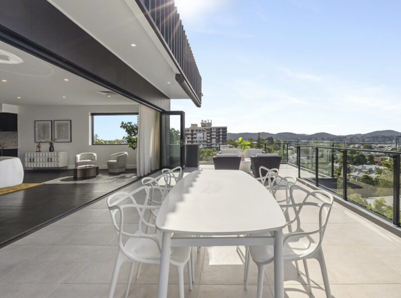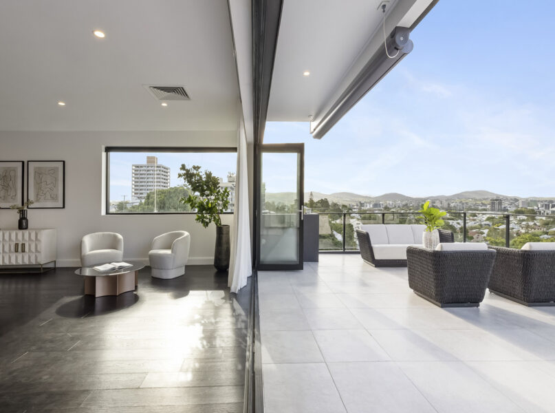 Perfectly oriented to capture the northern sun, the property boasts a spacious open-plan living and dining area on its first level. Gaze upon the iconic city skyline from this inviting central space, which seamlessly extends onto a 50 sqm automated awning and partially covered balcony, creating an unparalleled outdoor oasis.