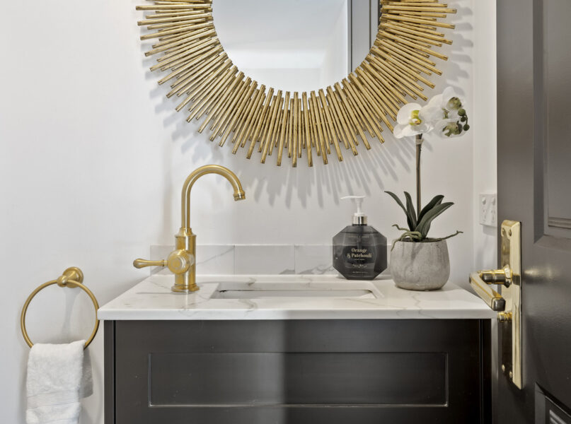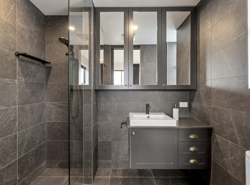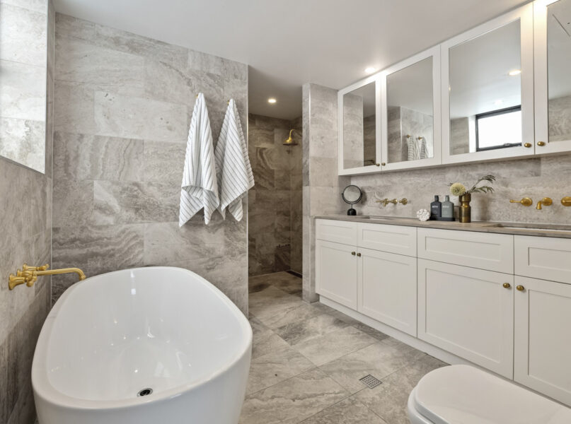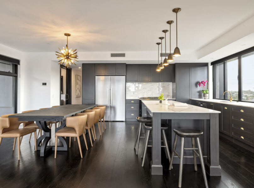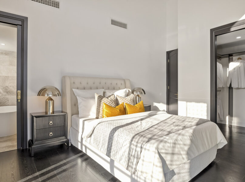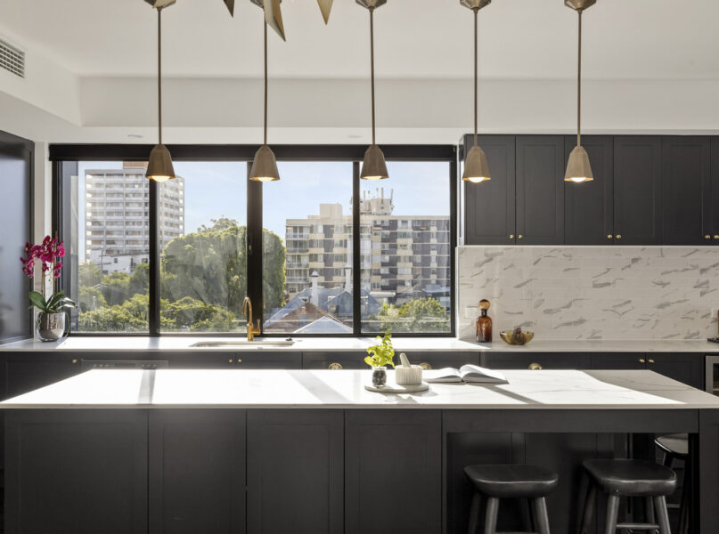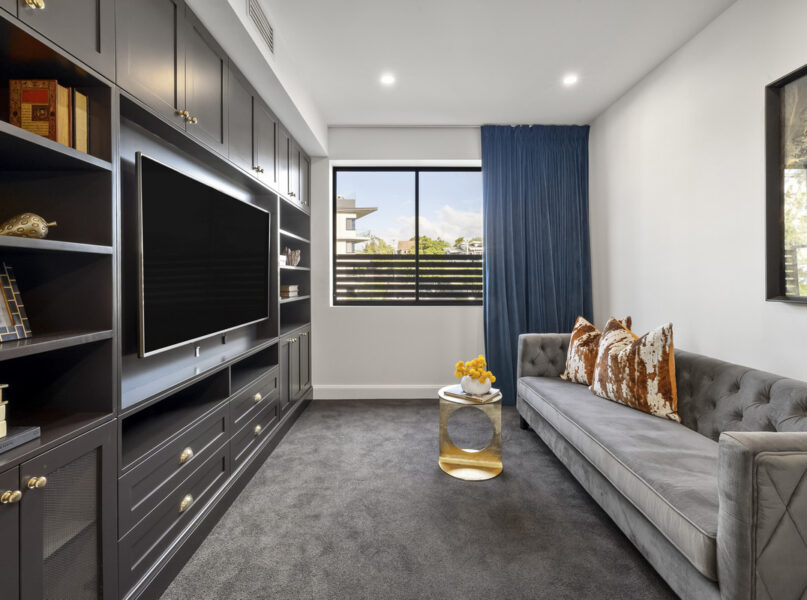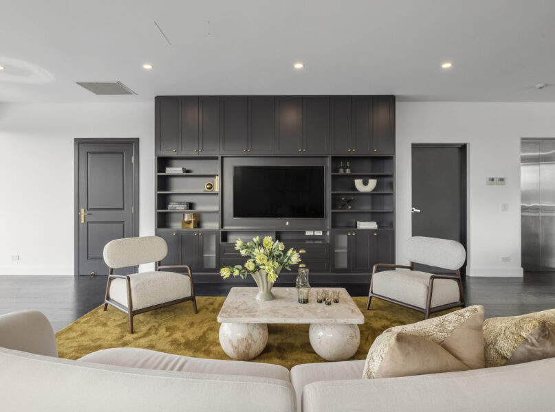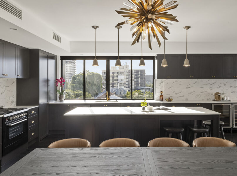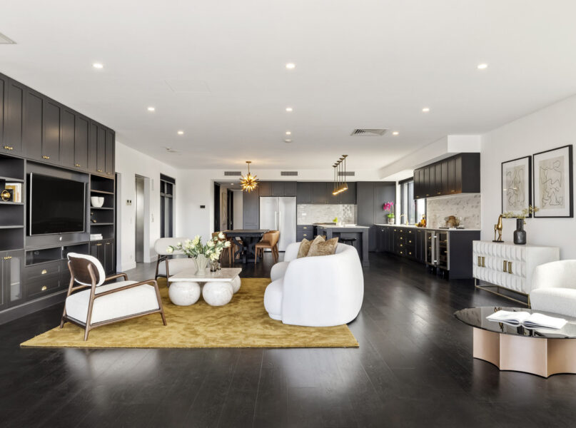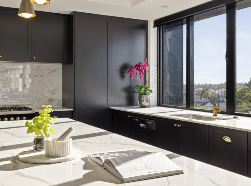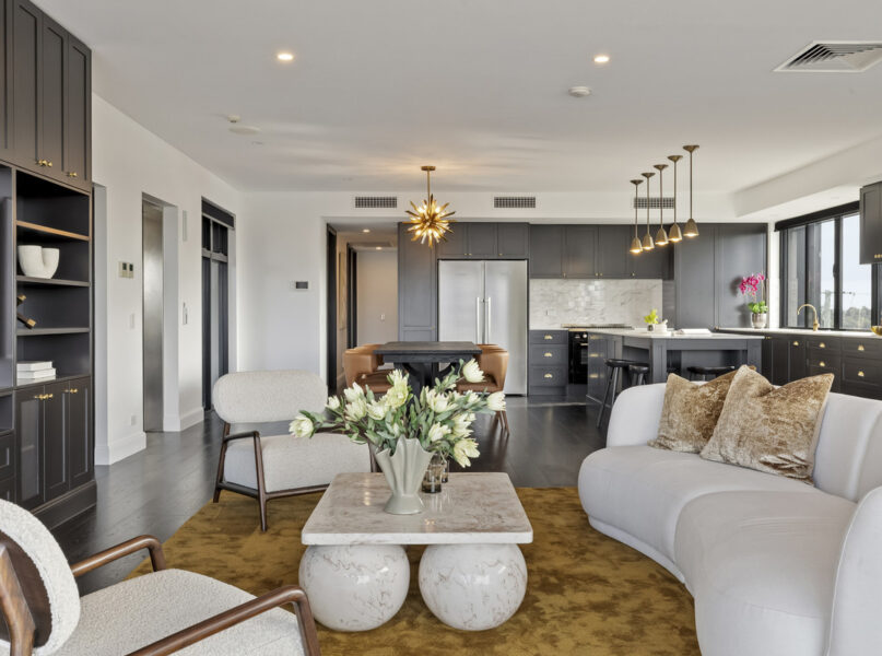 Discover the epitome of culinary luxury in this residence’s designer kitchen, boasting a spacious breakfast bar, imported tapware, golden-hued handles, a marble splashback, and ample matte black cupboard storage. A culinary enthusiast’s dream, this enviable space is outfitted with top-of-the-line Ilve appliances, including a gourmet oven and cooktop, complemented by an inbuilt butler’s pantry.