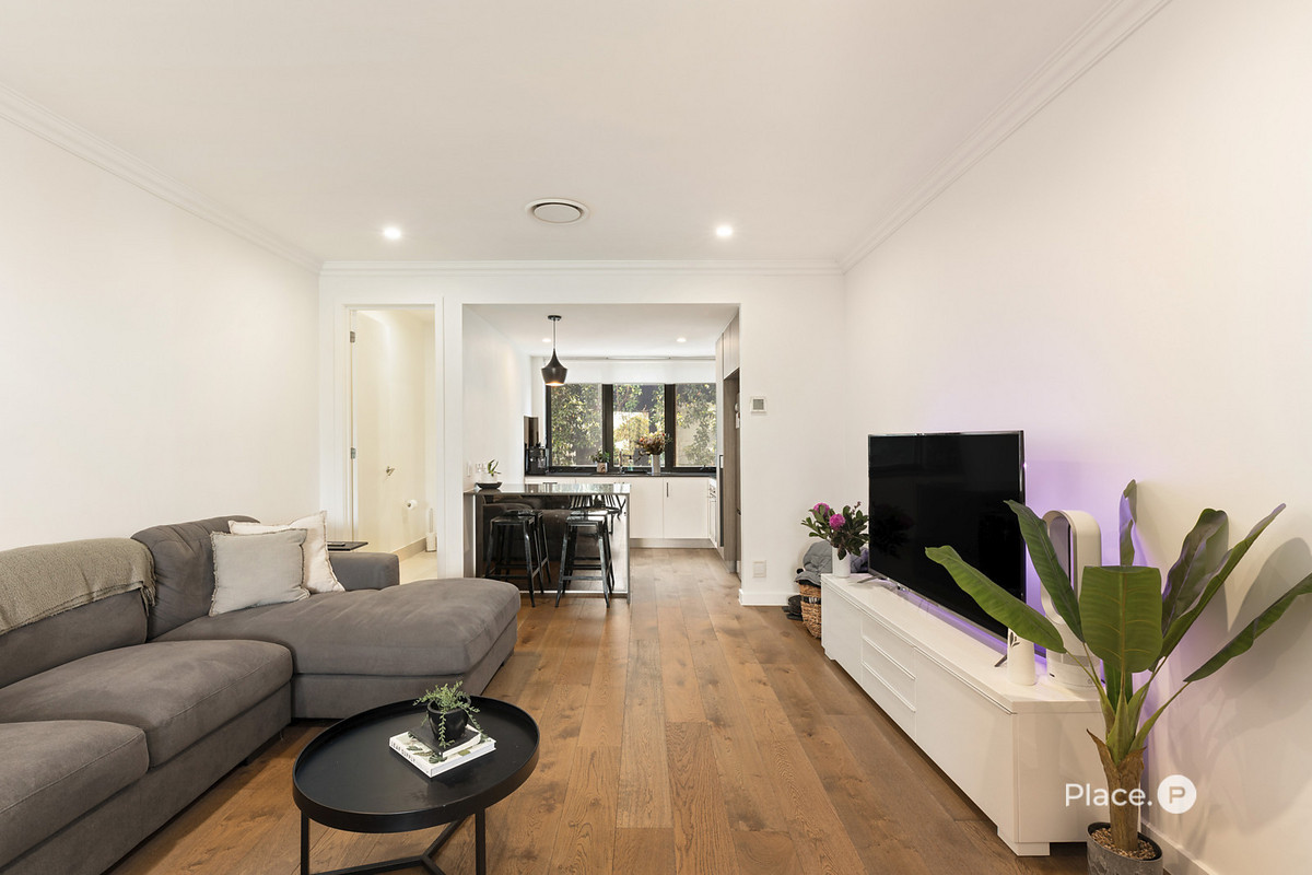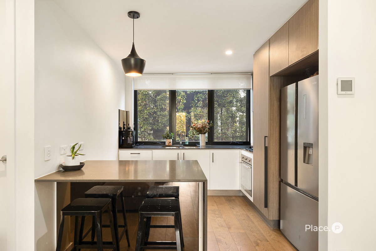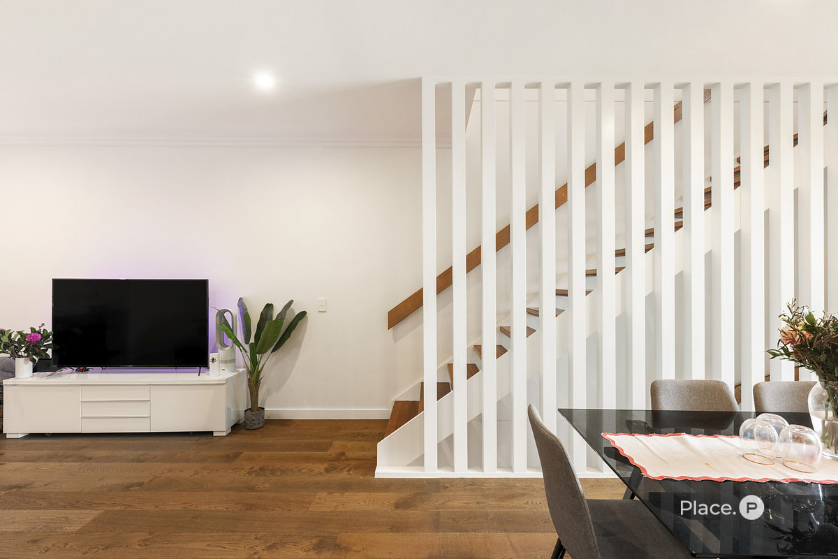 On the property’s third level, an ensuited master bedroom is accompanied by a stylish main bathroom and two additional bedrooms; all three are fitted with built-in robes. The residence also includes reverse-cycle air-conditioning, ceiling fans, an instantaneous gas hot water system and security doors and screens. Fire- and sound-proofed walls between the townhome and its neighbours ensure privacy.