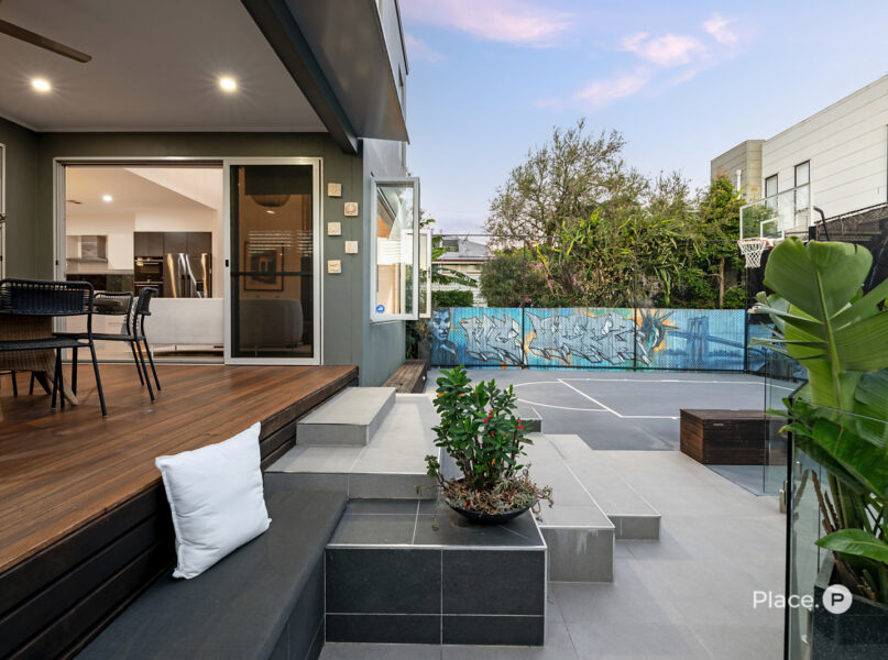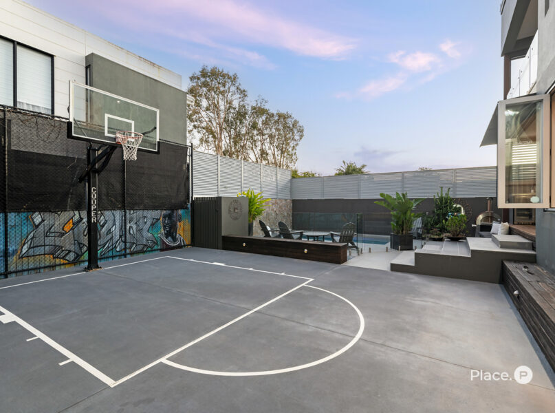Ensuring fantastic indoor-outdoor connection, large glass sliding doors open out to a firepit zone and a covered al fresco area encompassing an outdoor kitchen with an integrated barbecue, a gas burner and a drinks fridge. Continuing from here, a fully-fenced side yard features a glass-framed in-ground swimming pool, landscaped gardens and a rare basketball half-court. Families will also love the yard’s grassed area and vegetable gardens.