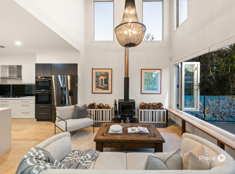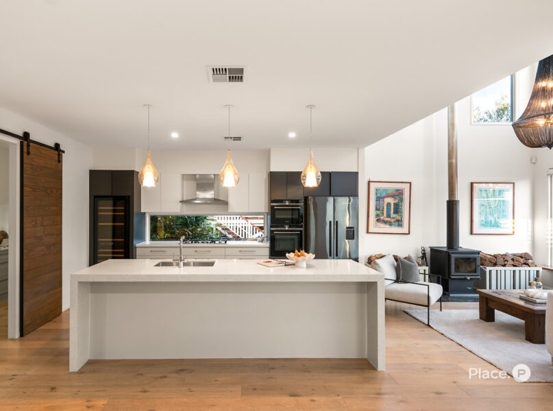 Benefitting from an intelligent layout, the home flows from its welcoming entry to a spacious open-plan living and dining area. Punctuated by a soaring double-height void, a bold pendant light and a charming fireplace, this airy central space adjoins an impeccable gourmet kitchen displaying stone benchtops and ample cupboard storage. Equipped with a butler’s pantry, this enviable culinary space also has near-new European appliances and a large breakfast bar.