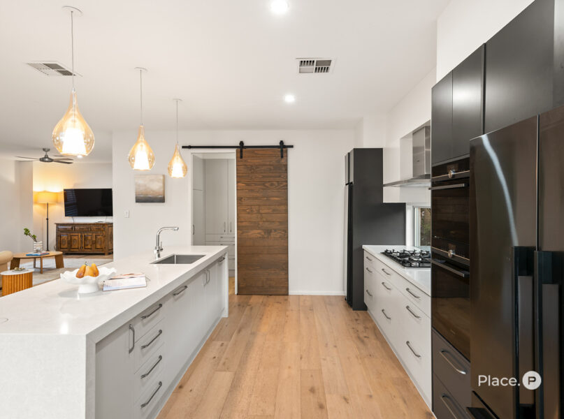 A celebration of contemporary design, the residence is given marvellous street appeal by its striking modern facade, gated entry, large pandanus palm tree and mature front gardens. Continuing the elegance inside are details such as timber floors, lofty ceilings and plantation shutters.