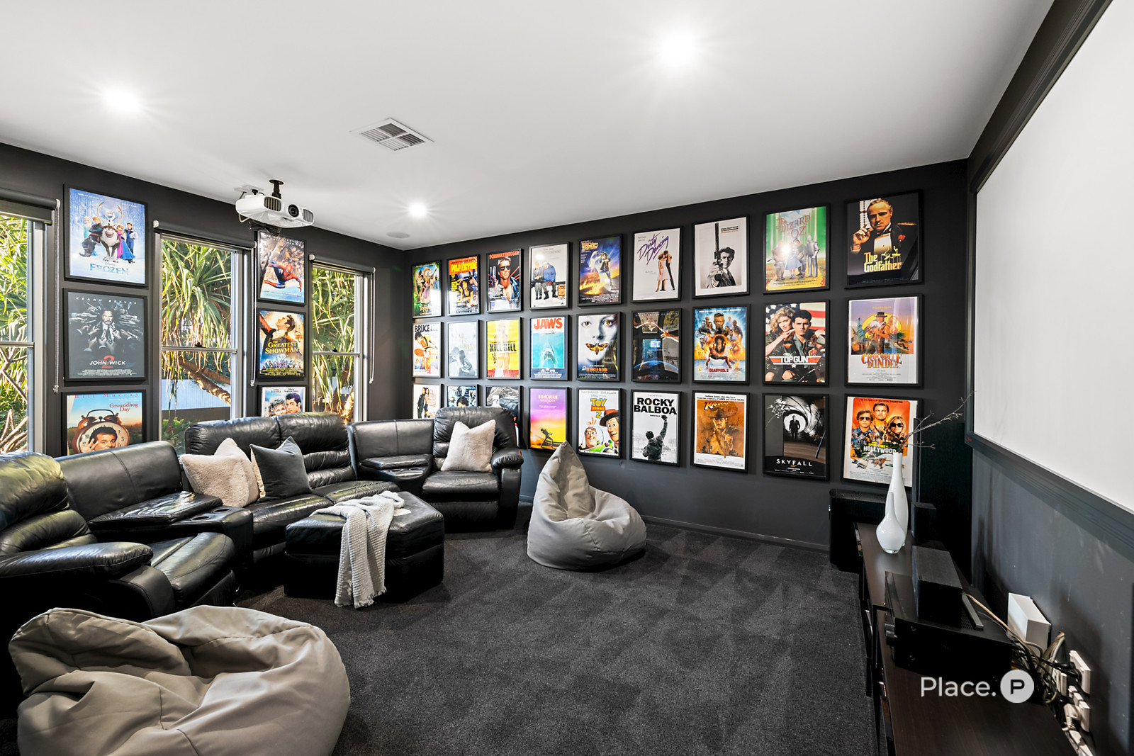 Also on this level, a purpose-built home cinema will enhance your family’s ‘movie nights’ with its projector and surround sound system. A functional mudroom has built-in storage – perfect for families.