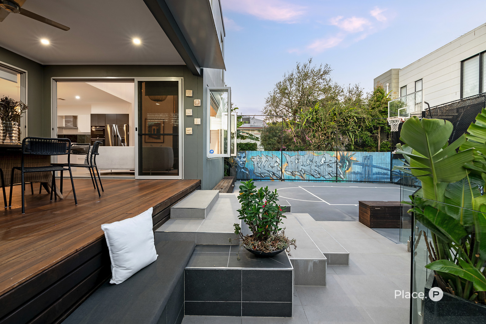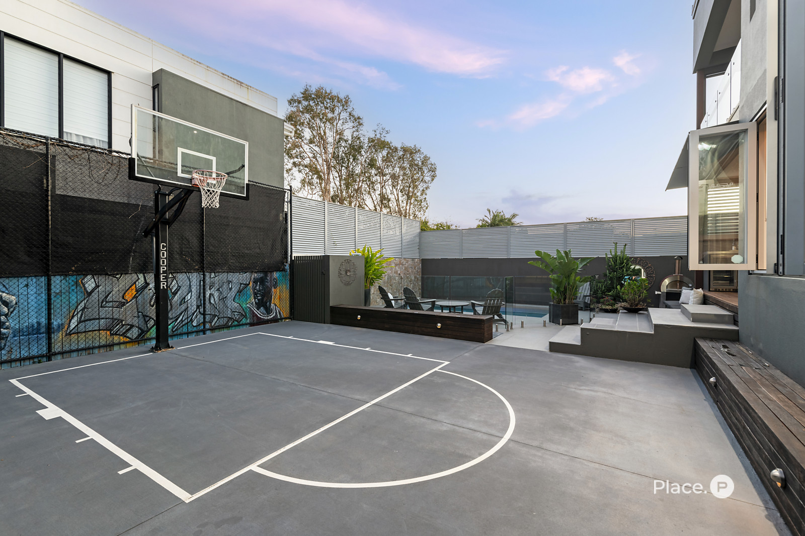 Ensuring fantastic indoor-outdoor connection, large glass sliding doors open out to a firepit zone and a covered al fresco area encompassing an outdoor kitchen with an integrated barbecue, a gas burner and a drinks fridge. Continuing from here, a fully-fenced side yard features a glass-framed in-ground swimming pool, landscaped gardens and a rare basketball half-court. Families will also love the yard’s grassed area and vegetable gardens.