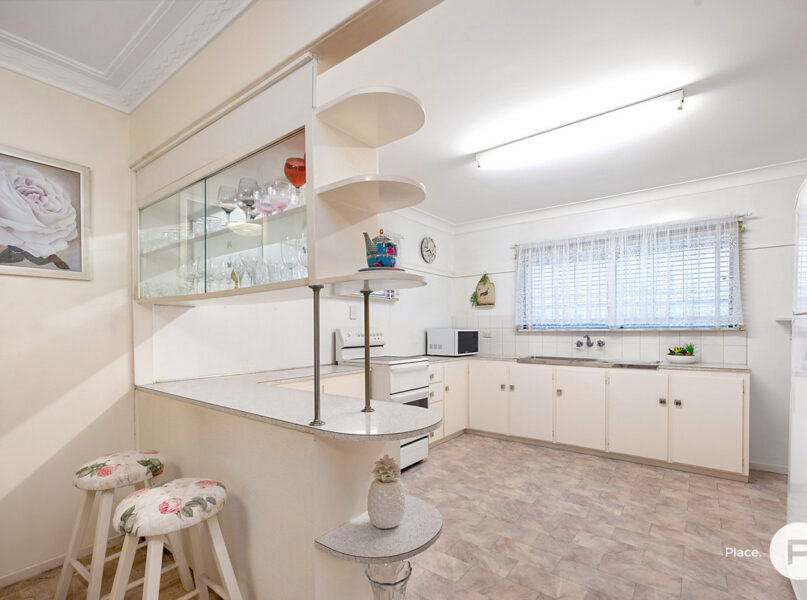 – Adjoining kitchen featuring a breakfast bar, a tiled splashback and ample cupboard storage