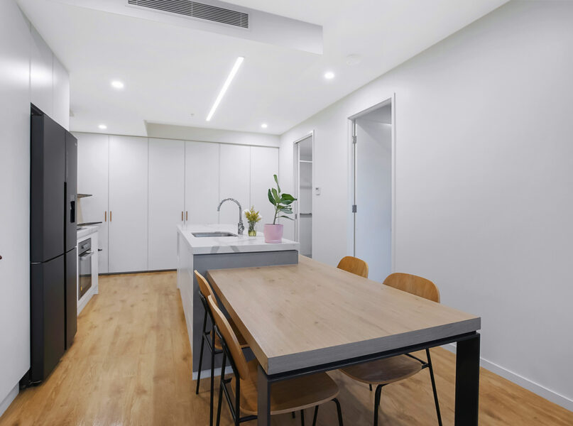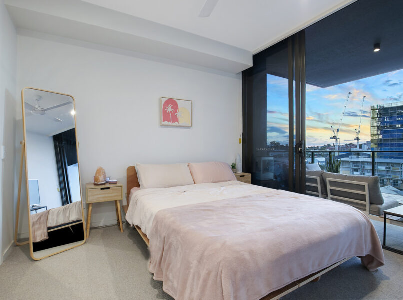 Complementing its cosmopolitan setting with a tasteful modern aesthetic, the residence showcases elegant timber floors and a fresh white colour palette. Full-height glass reveals an impressive vista, which stretches out over Woolloongabba to the city skyline.