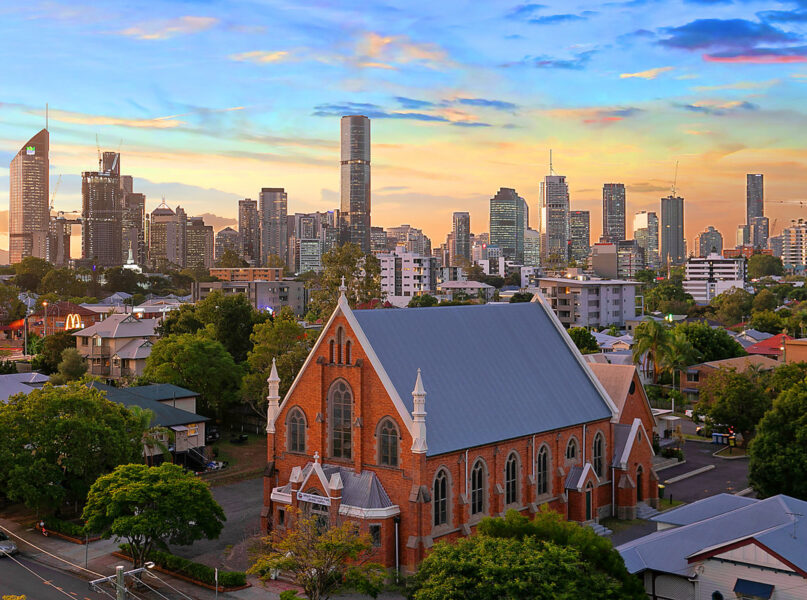 Perfect for relaxing and hosting guests, a covered corner balcony looks out across the historic Kangaroo Point Uniting Church and Brisbane’s CBD beyond.