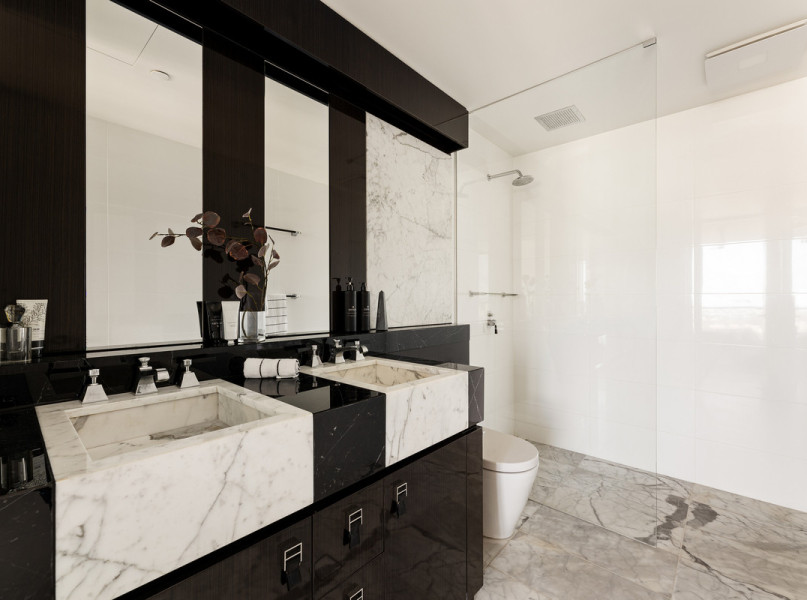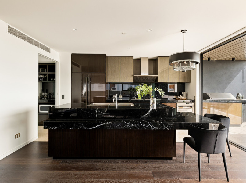 Accessible via lift, the residence encompasses a spacious open-plan living and dining area bathed in natural light. Providing everything you need to prepare a delicious meal, an immaculate adjoining kitchen displays striking stone benchtops, a breakfast bar, a butler’s pantry, premium appliances and ample cupboard storage.