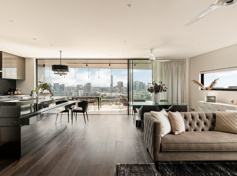 Commanding breathtaking views of tree-dotted West End and the iconic city skyline, the apartment has been expertly crafted to ensure luxury living. Showcasing exquisite timber floors and stone accents, the property is also presented with full-height glass that highlights the spellbinding outlook.