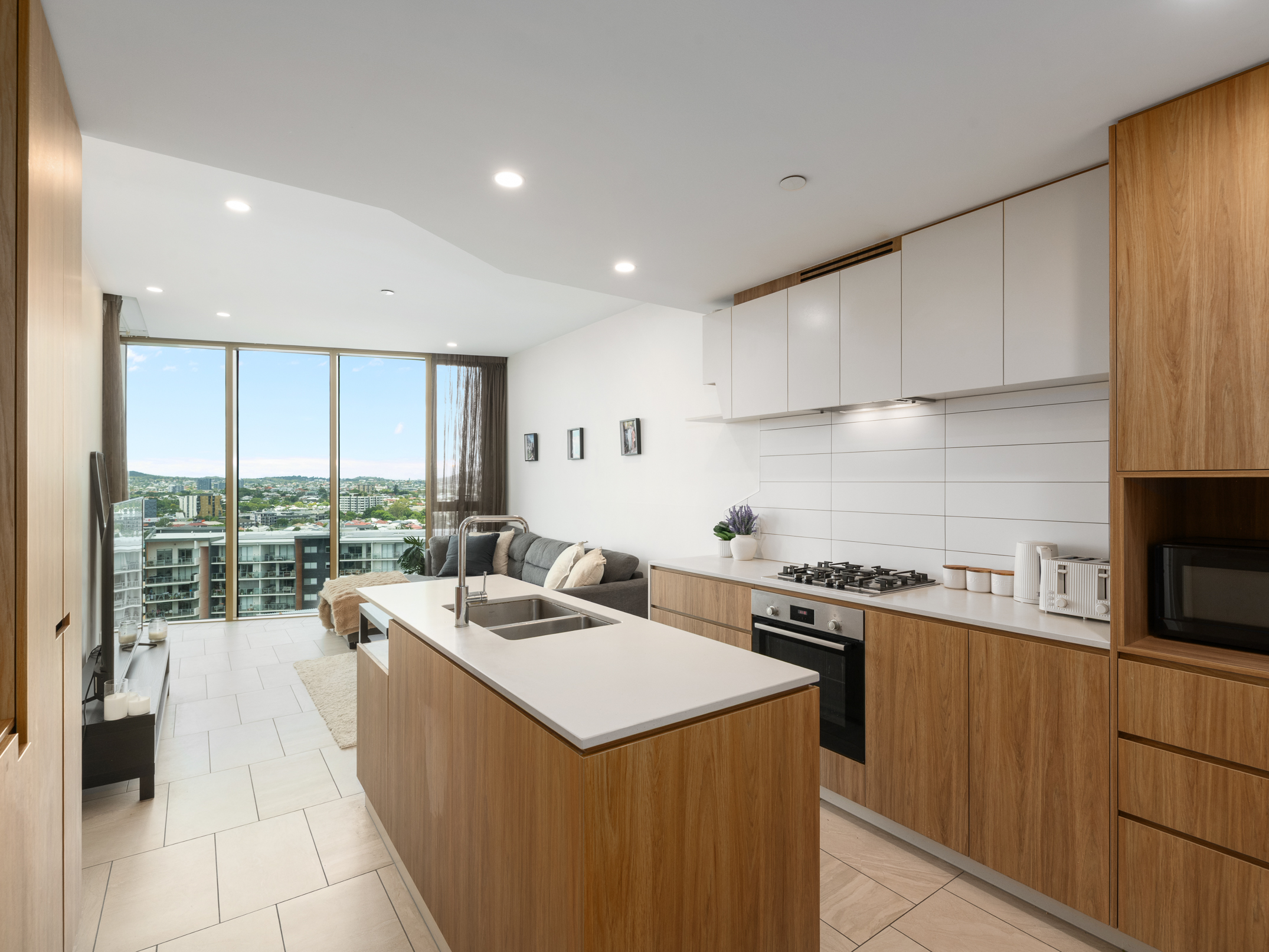 A spacious open-plan lounge and living area forms the heart of the home, seamlessly flowing to the covered balcony—ideal for entertaining or unwinding while enjoying the spectacular outlook. The sleek kitchen is finished with stainless steel Bosch appliances, a gas cooktop, ample cabinetry and streamlined modern finishes, offering both elegance and functionality.