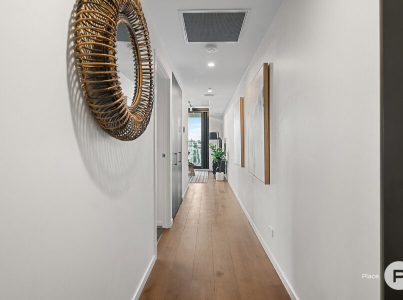 Showcasing sweeping views of the Brisbane River and Brisbane CBD, the residence features timber and carpeted floors. Sophisticated polished-concrete ceilings and banks of full-height glass also come together to create a contemporary setting.