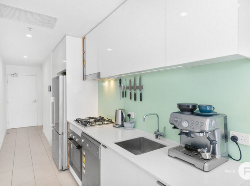 Adjoining this light-filled space is a functional study nook and kitchen with quality appliances, a glass splashback and cupboard storage. Cook up a meal for two and take in the skyline from your own private haven or treat yourselves to a romantic dinner at the popular Greenhouse Canteen + Bar or Evening in India located on the complex’s street level. A multitude of restaurants and cafes are also just moments away, such as Billykart West End, Bird’s Nest, The Charming Squire and Fish Lane.