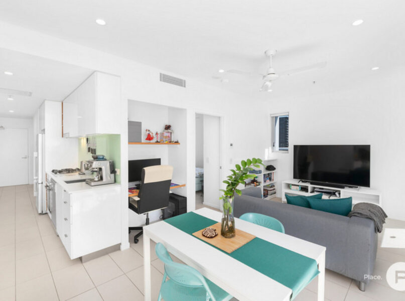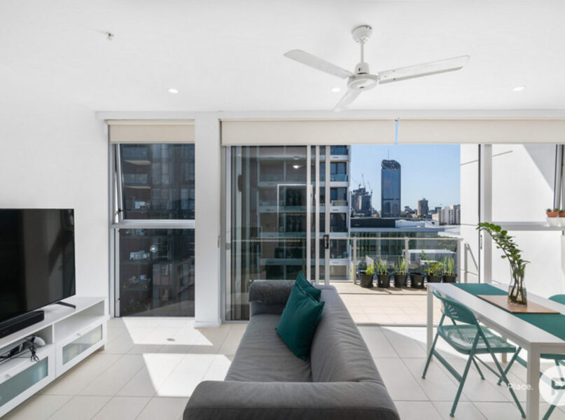 Situated in South Brisbane’s The Plaza complex, the property invites residents to appreciate the outlook from its open-plan living and dining area. Welcoming natural light into the air-conditioned property, entering out to the covered balcony to reveal the city skyline. This is where you could gather family and friends on New Year’s Eve and Sunsuper Riverfire.