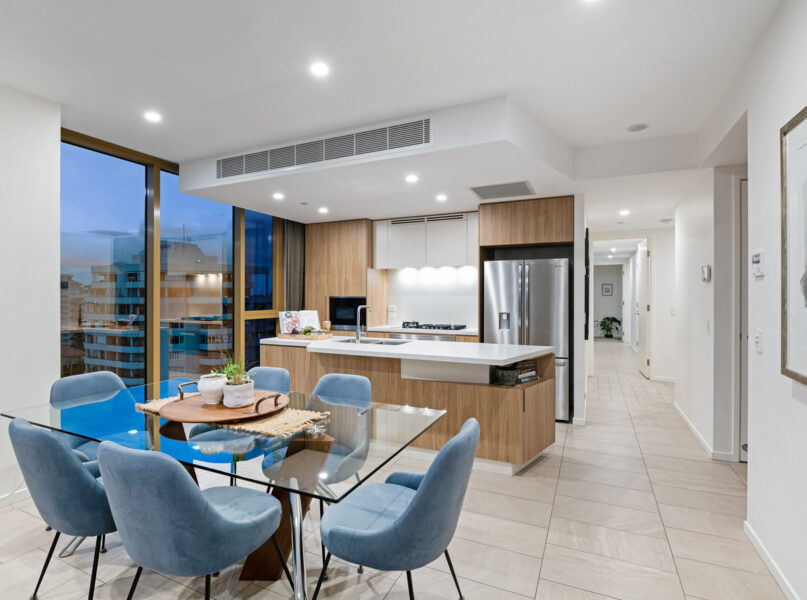 A spacious open-plan living and dining area creates a captivating first impression, allowing you to relax and host guests with ease. Seamlessly integrating out onto a covered balcony capturing phenomenal city views, this impeccable central space adjoins a chef’s kitchen.