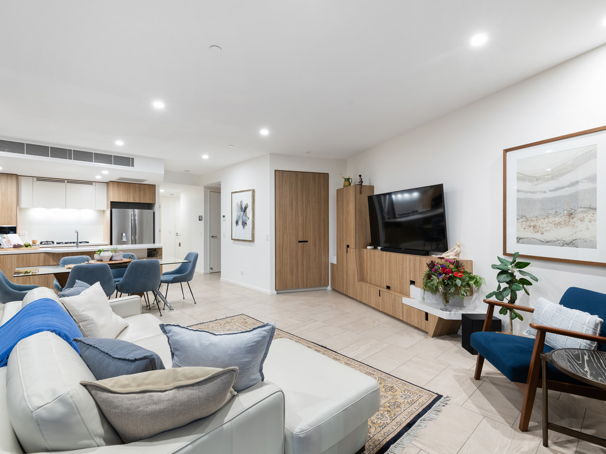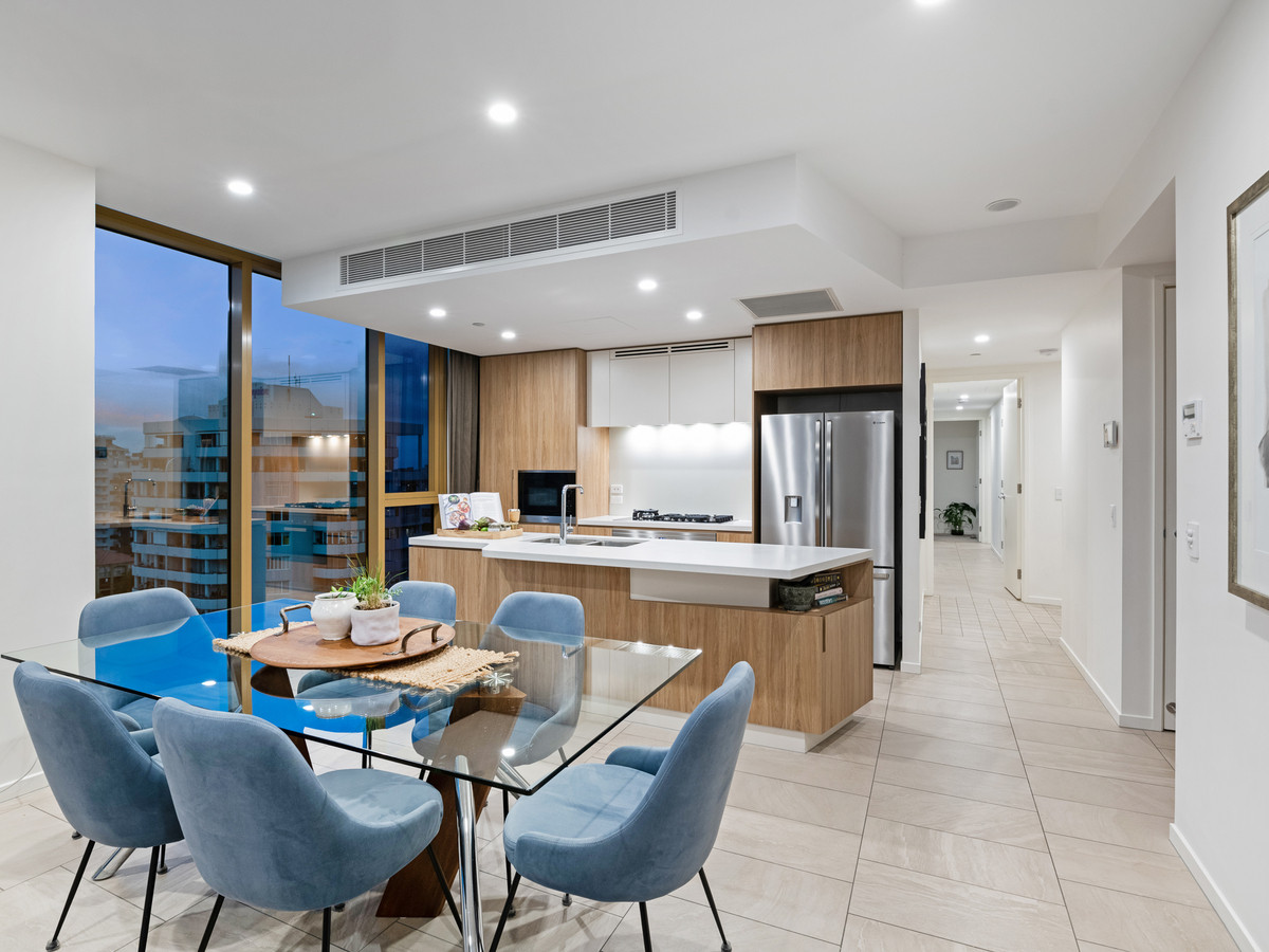 A spacious open-plan living and dining area creates a captivating first impression, allowing you to relax and host guests with ease. Seamlessly integrating out onto a covered balcony capturing phenomenal city views, this impeccable central space adjoins a chef’s kitchen.