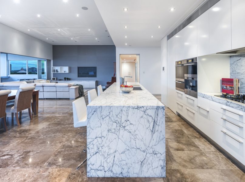 Commanding an entire floor, accessed from the secure lock up four car garage by lift into a private lobby entrance, this penthouse is truly rare. With unique 4.5m ceilings showcasing the views and open plan living and dining finished with beautiful marble flooring, custom joinery and feature acoustic wall.