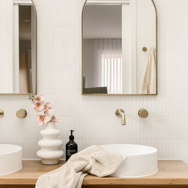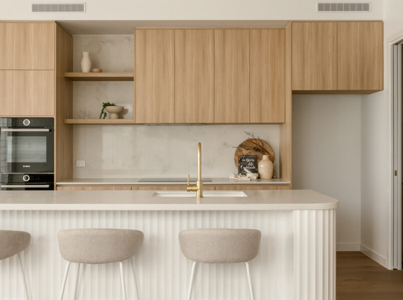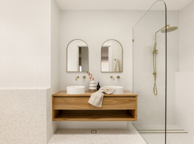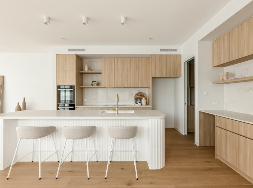 Capturing wonderful natural light, the home’s ground level encompasses a spacious open-plan living and dining area with a built-in media unit. Flowing from a welcoming entryway on a lower split level, this airy central space adjoins a sensational kitchen displaying 40-millimetre stone benchtops, a breakfast bar, a butler’s pantry and ample cupboard storage. A suite of premium Bosch appliances includes two ovens, an induction cooktop, a rangehood and an integrated dishwasher.