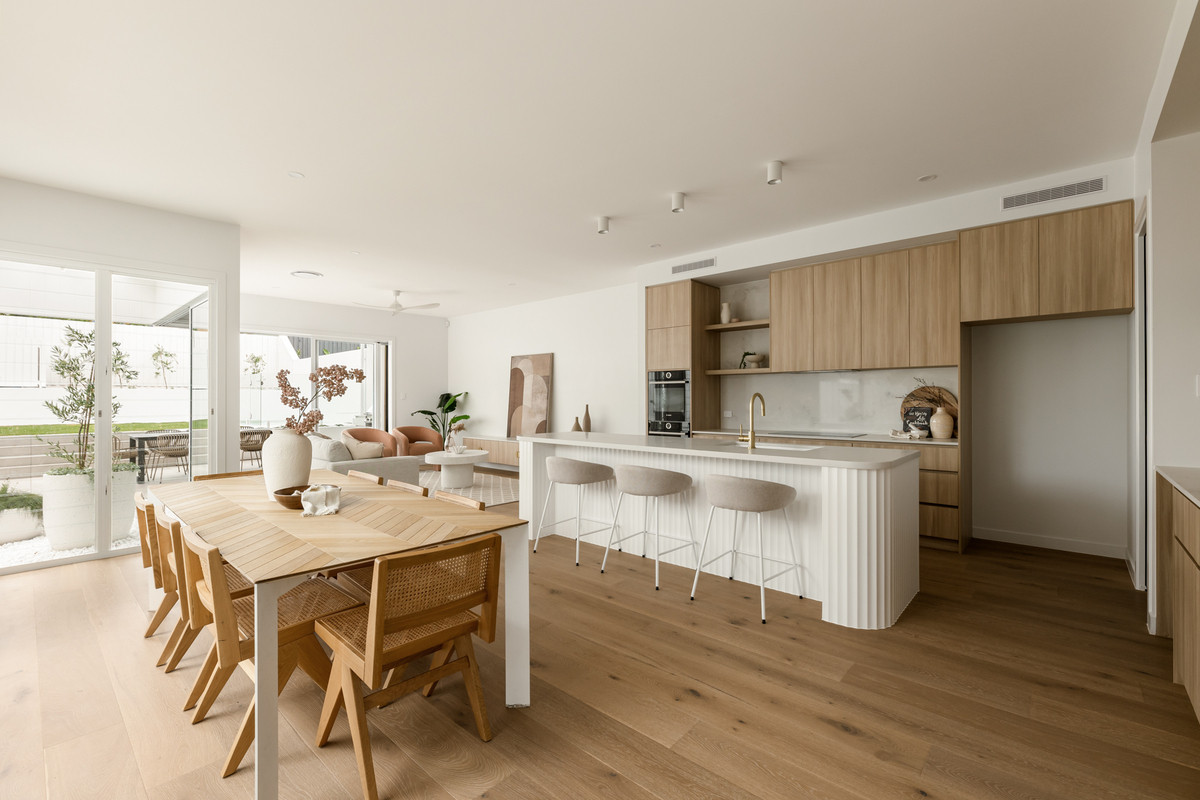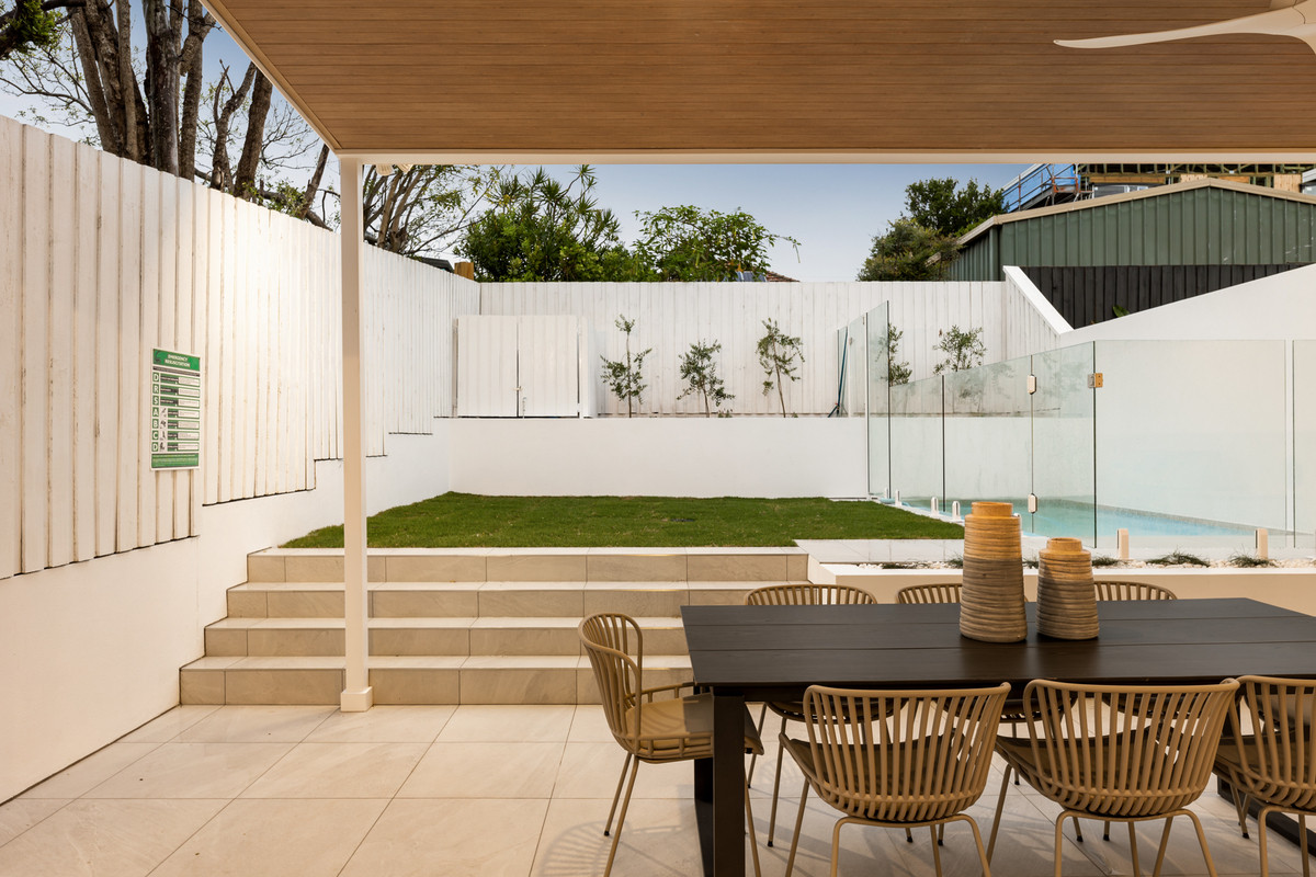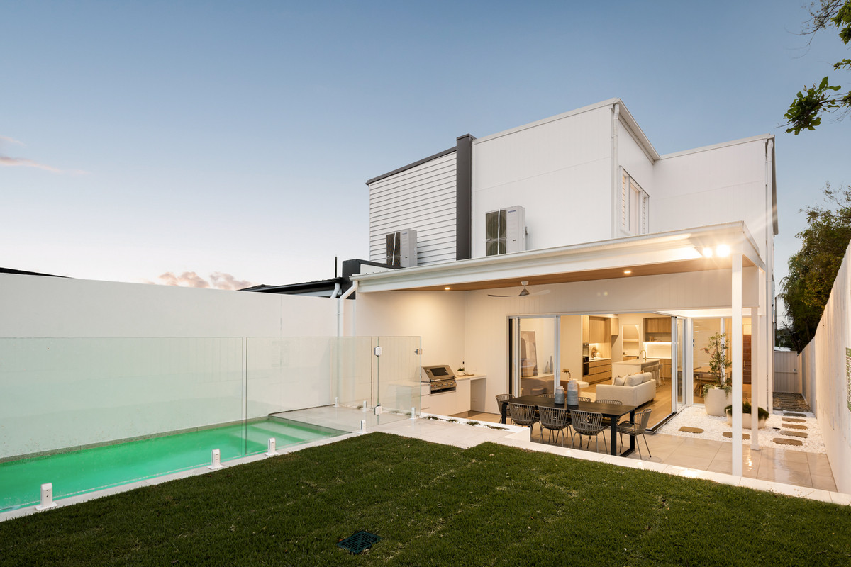 Encouraging indoor-outdoor living, an attached and covered al fresco area has a full outdoor kitchen with a built-in barbecue. There is also a fully-fenced grassed rear yard benefitting from raised garden beds and a glass-framed in-ground swimming pool.