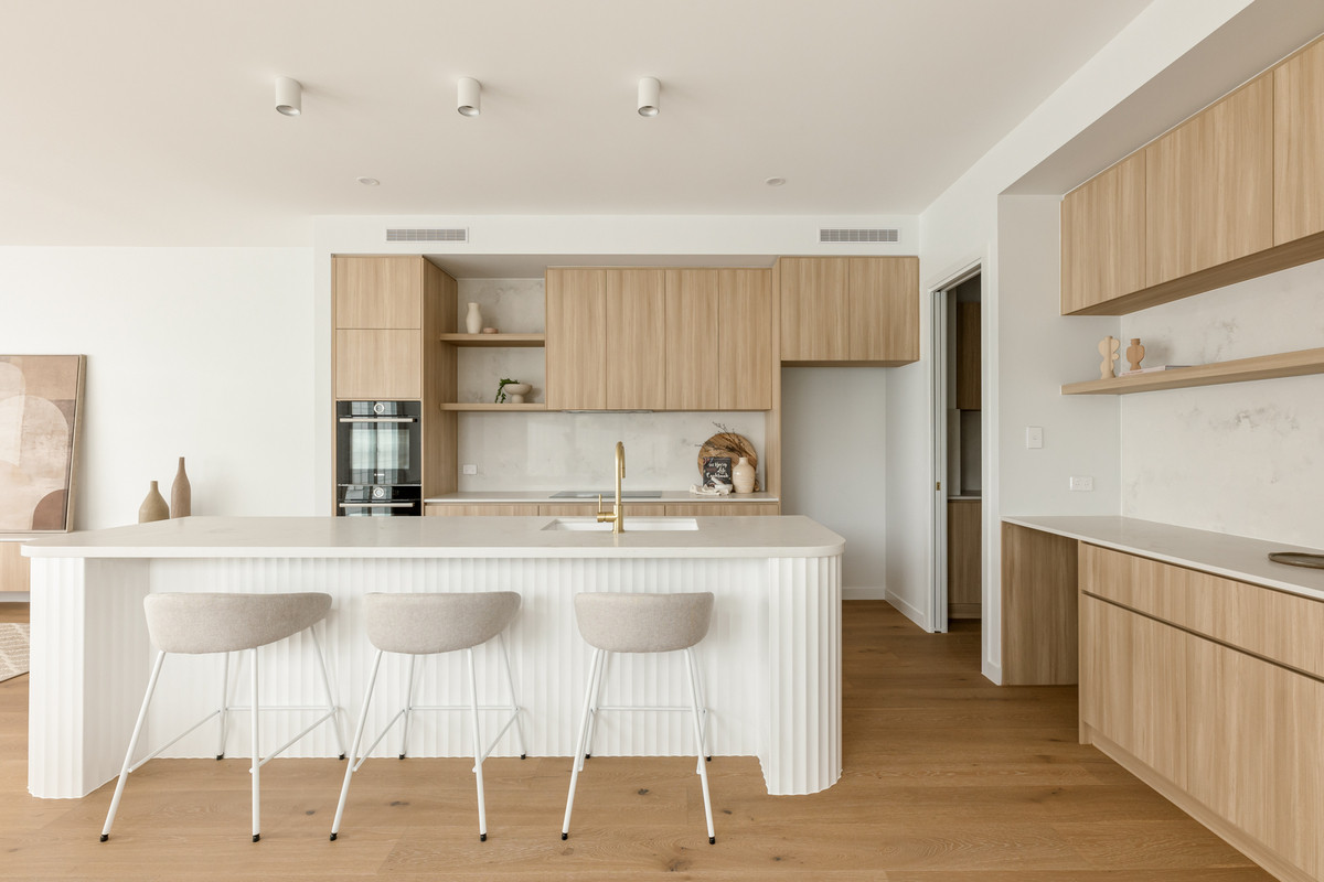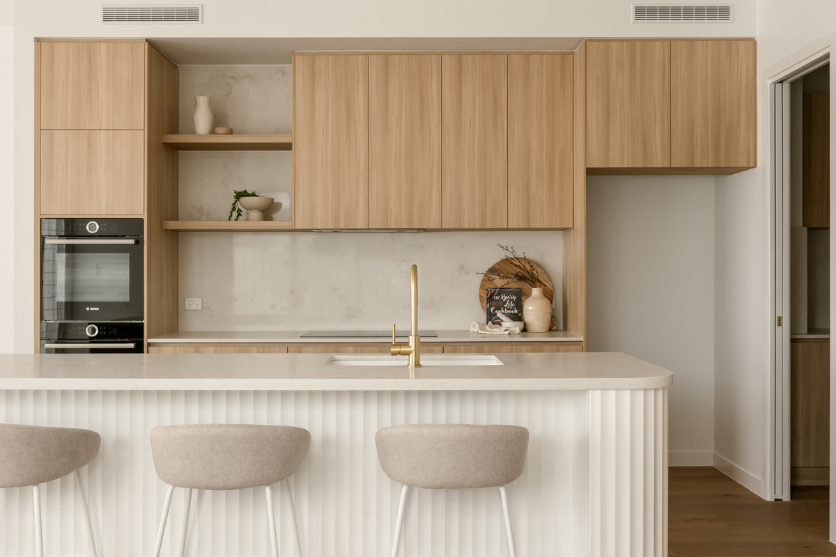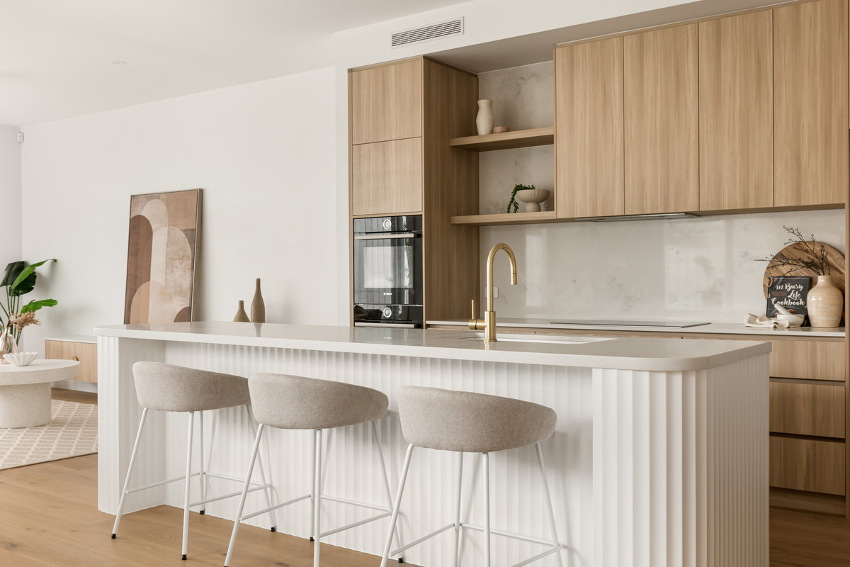 Capturing wonderful natural light, the home’s ground level encompasses a spacious open-plan living and dining area with a built-in media unit. Flowing from a welcoming entryway on a lower split level, this airy central space adjoins a sensational kitchen displaying 40-millimetre stone benchtops, a breakfast bar, a butler’s pantry and ample cupboard storage. A suite of premium Bosch appliances includes two ovens, an induction cooktop, a rangehood and an integrated dishwasher.