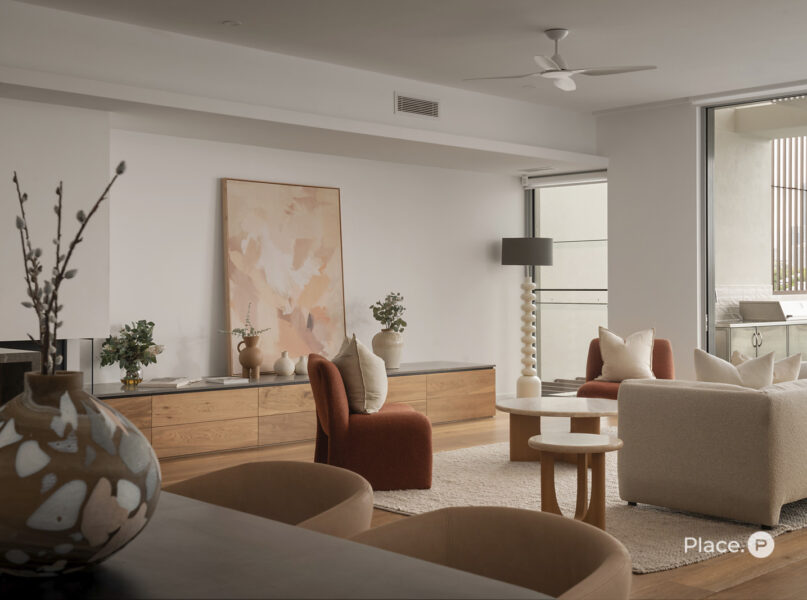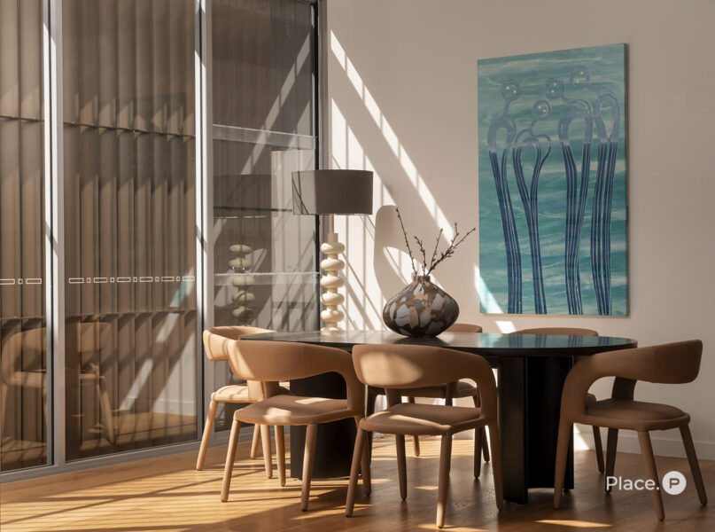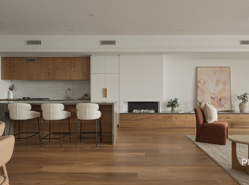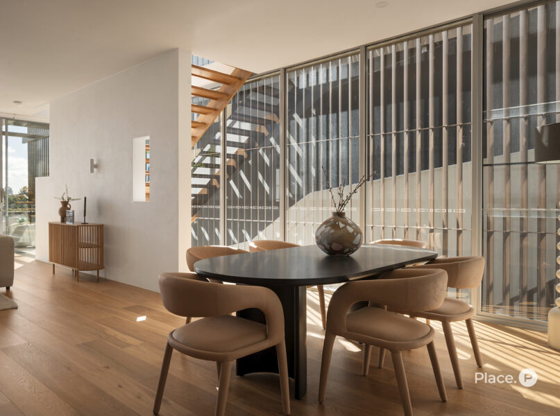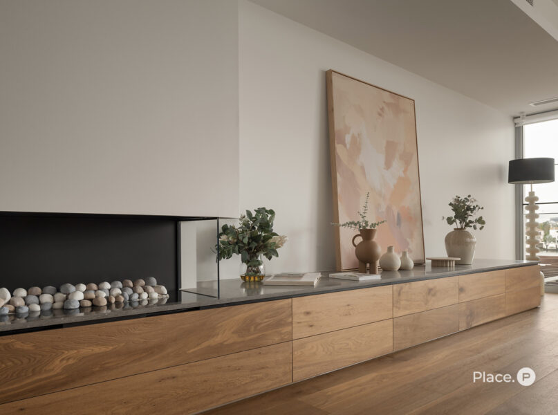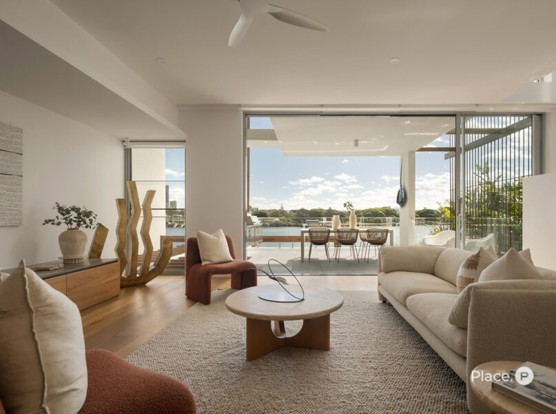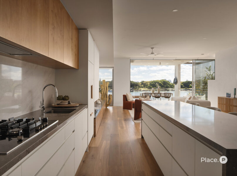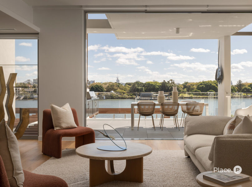 Serviced by a private lift, the residence encompasses a spacious open-plan living and dining area on its middle level. Punctuated by a sleek fireplace and integrated joinery, this airy central space spills out onto a covered river-facing balcony with a full outdoor kitchen. Ideal for toasting the sunset in sheer luxury, this brilliant outdoor entertainment area also lends itself to fabulous barbecues and leisurely al fresco meals.