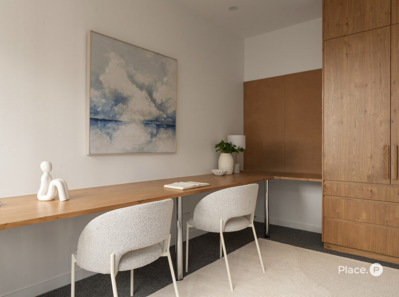 There is also a dedicated study with built-in desks, while a well-appointed main bathroom and two additional bedrooms featuring built-in robes are downstairs.