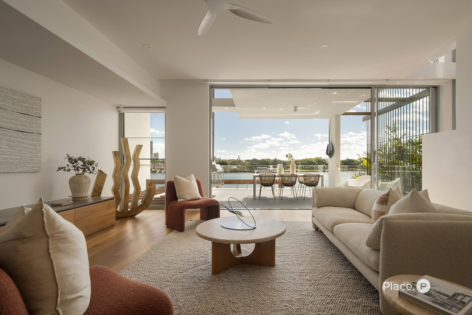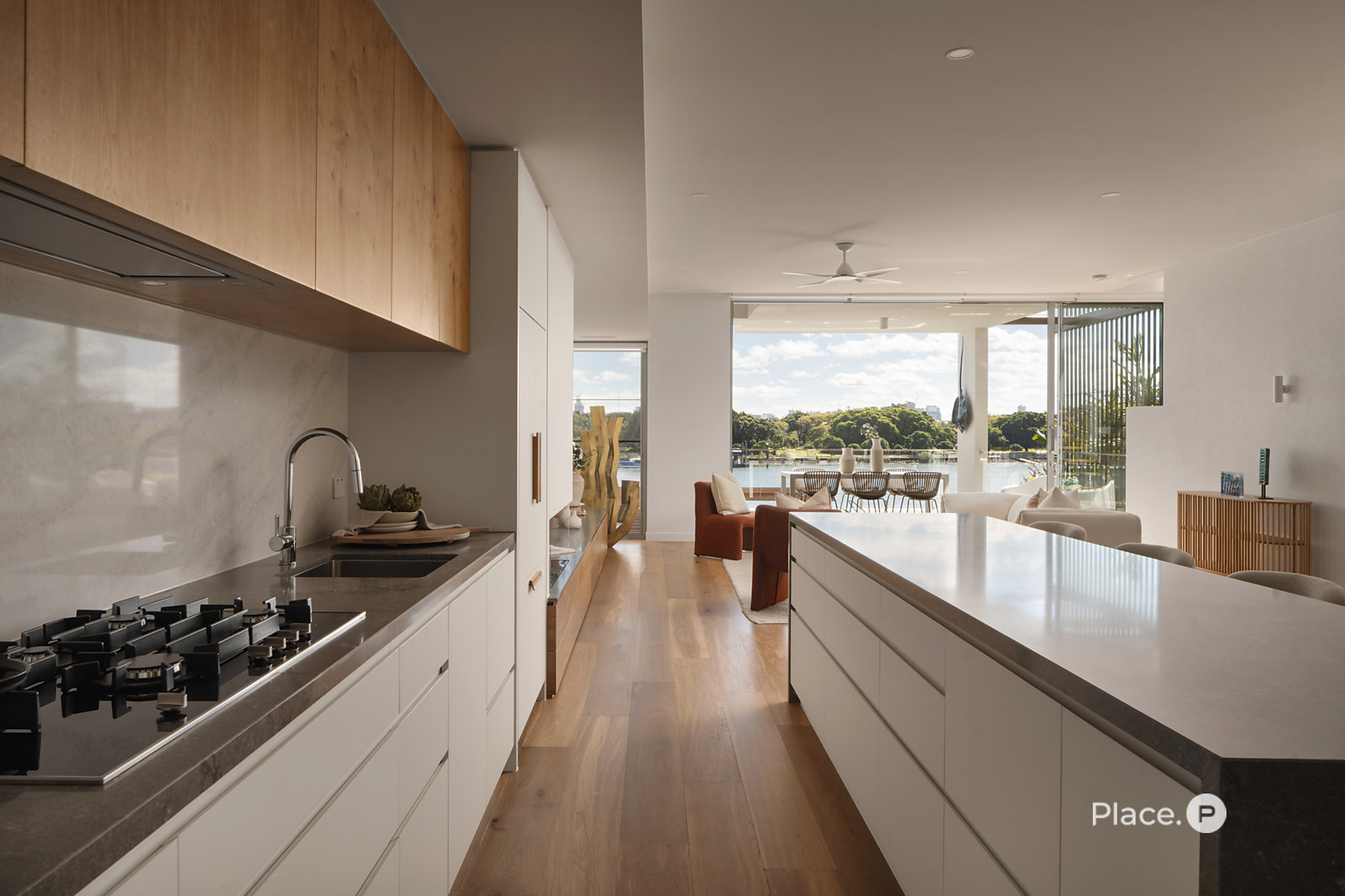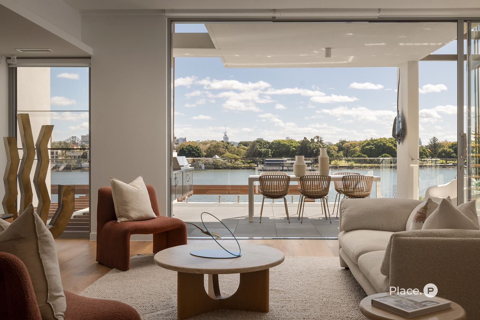 Serviced by a private lift, the residence encompasses a spacious open-plan living and dining area on its middle level. Punctuated by a sleek fireplace and integrated joinery, this airy central space spills out onto a covered river-facing balcony with a full outdoor kitchen. Ideal for toasting the sunset in sheer luxury, this brilliant outdoor entertainment area also lends itself to fabulous barbecues and leisurely al fresco meals.