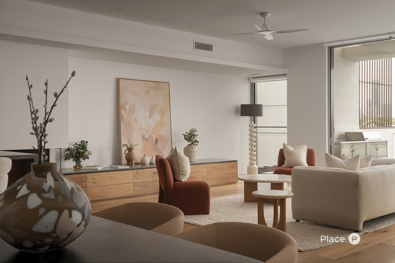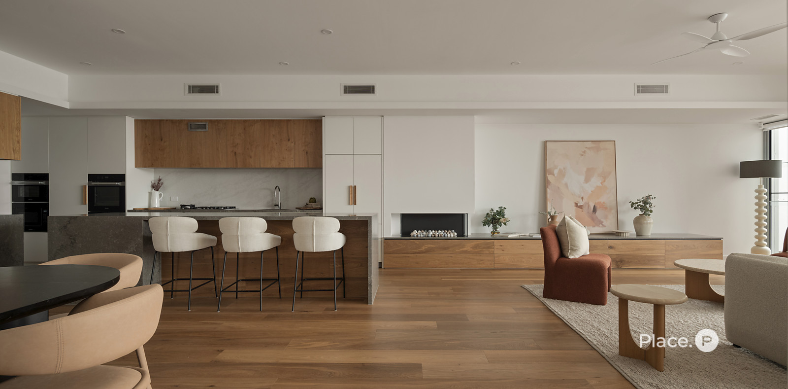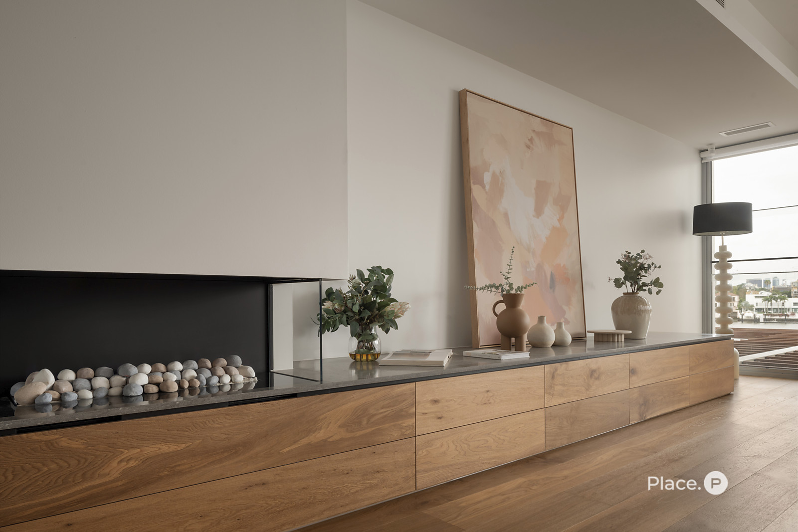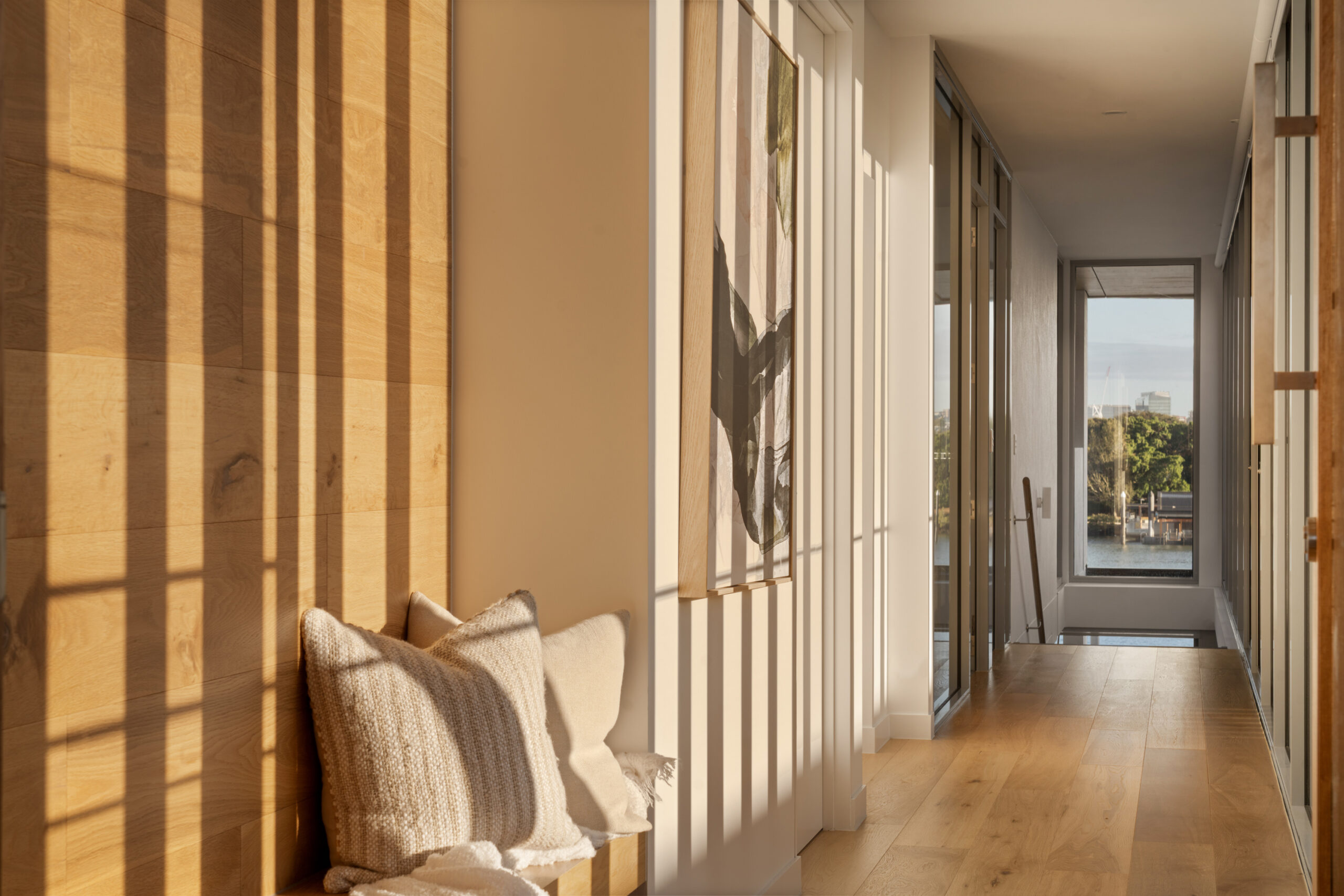 Serviced by a private lift, the residence encompasses a spacious open-plan living and dining area on its middle level. Punctuated by a sleek fireplace and integrated joinery, this airy central space spills out onto a covered river-facing balcony with a full outdoor kitchen. Ideal for toasting the sunset in sheer luxury, this brilliant outdoor entertainment area also lends itself to fabulous barbecues and leisurely al fresco meals.